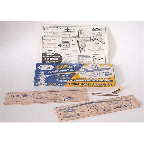Guillow's Zip Jet Flying Model Kit, balsa wood plane complete with original instructions imprinted "Copyright 1955 by PAUL K. GUILLOW, INC. WAKEFIELD, MASS." Box measures 9" long x 2-3/4" tall. LOCKEHEED STARFIRE IS THE ONE AVAILABLE HERE.