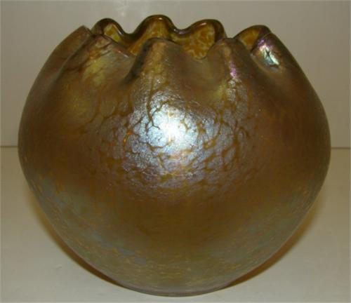 SIGNED LOETZ ART GLASS ROSE BOWL. Gold iridescent. Signed on bottom “Loetz/Austria”. Excellent condition. 4.5” H