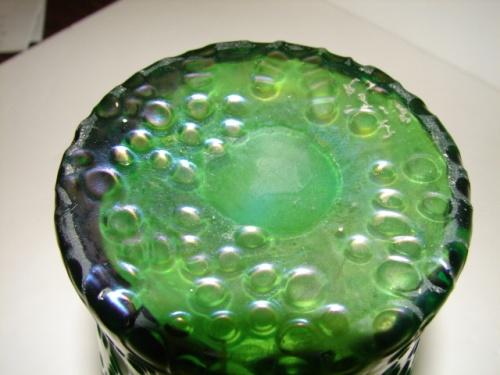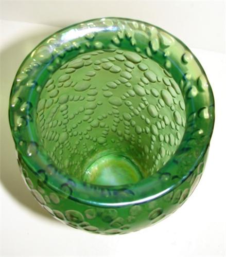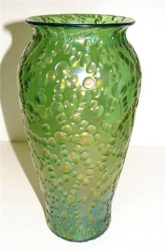 SIGNED LOETZ GREEN ART GLASS VASE. Diaspora pattern. Signed on bottom “Loetz/Austria”. Excellent condition. 11” H