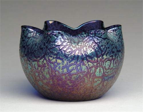 LOETZ BOWL. Pretty Loetz bowl has blue and green iridescent crackle design against a cobalt blue ground. Vase has ruffled rim. SIZE: 3-1/2 in. t. CONDITION: Very good to excellent. Collection of Dr. C. and Margaret Chastain 5-61538