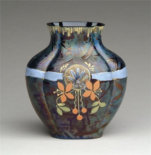LOETZ DECORATED VASE. Nice Loetz vase has iridescent randomly textured finish against a cobalt blue background. Vase also has enamel decoration of light blue band around shoulder with center medallion housing blue stylized flower with stylized stems extending from medallion and supporting orange flowers and green leaves. Outer lip of vase is decorated with yellow enamel random drip design. SIZE: 5 in. t. CONDITION: Very good to excellent. Collection of Dr. C. and Margaret Chastain 5-61450