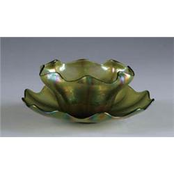 Lot 842 LOETZ FINGERBOWL AND UNDERPLATE Rare Loetz oil-spot decorated ruffled bowl with matching under-plate. Unsigned. SIZE: 3” t x 7” w. CONDITION: Very good to excellent. 5-70857