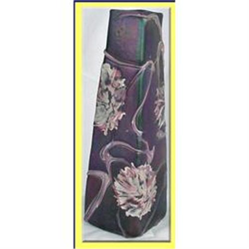 Roughly diamond shaped with unequal, clearly handformed sides, tapering towards the top. Very rare technique of inlaid / marquetry glass, most famously made late 19th century by Emil Galle and considered the apex of his artistry. The glass is iridescent amethyst with pink and white inlaid flowers and stems, bending and twisting in every direction and even leaving the ground of the vase at one point and forming an arch (see 'photos).