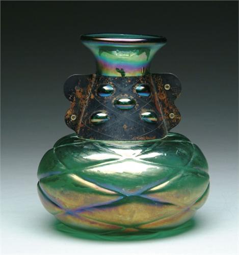 LOETZ TYPE ART GLASS VASE. Iridescent green blown out diamond quilted vase with an applied blown into metal collar with raspberry highlights. SIZE: 7 in. t. CONDITION: Very good to excellent. 8-87074