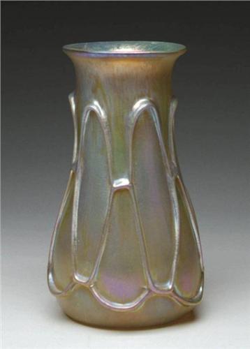 LOETZ VASE. Beautiful Loetz has amber glass with iridescent gold finish and applied looping decoration. Unsigned. SIZE: 9-1/2" t. CONDITION: Very good to excellent. 8-87390