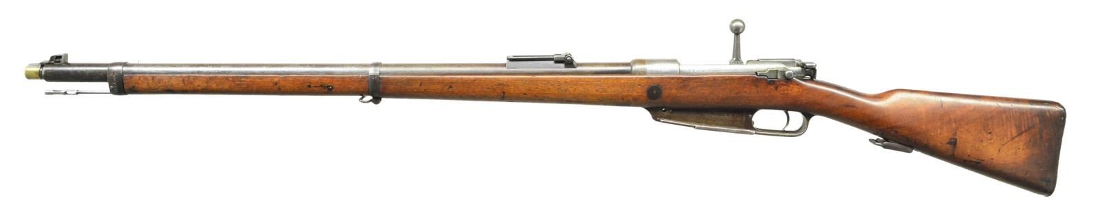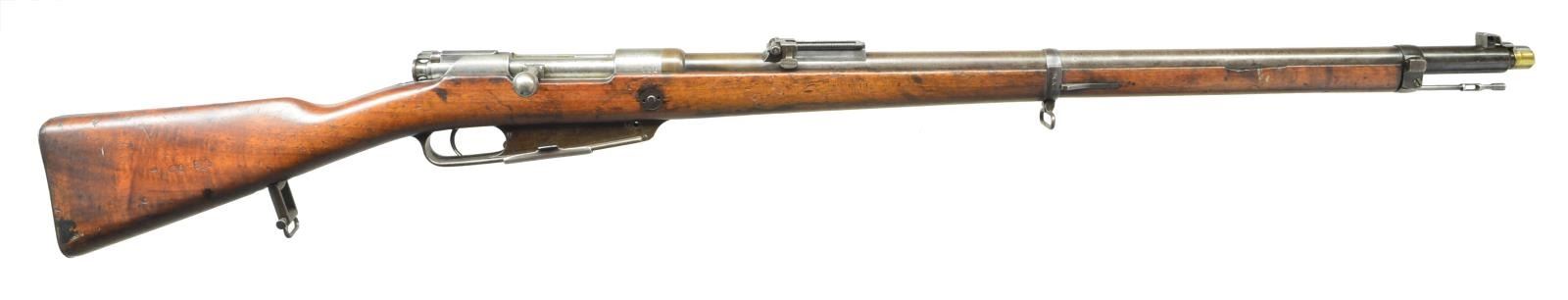 Cal. 8X57. S# 757g. 30" Bbl. is fitted with long range rear and military type front sights with front sight protector. Mannlicher type action is marked "LOEWE BERLIN 1891" on receiver ring along with "Z" & "S" indicating conversion to use with .323 bore ammo. Walnut stock shows some grain figure and is stamped with German markings on right side of butt. CONDITION: fair to good. Metal parts retaining traces of original blue. Stock with many marks and what's left of its original finish. Good bore, dark in grooves. Mechanically smooth. (01-20693/MGM). ANTIQUE. $500-900.