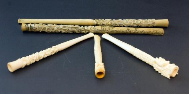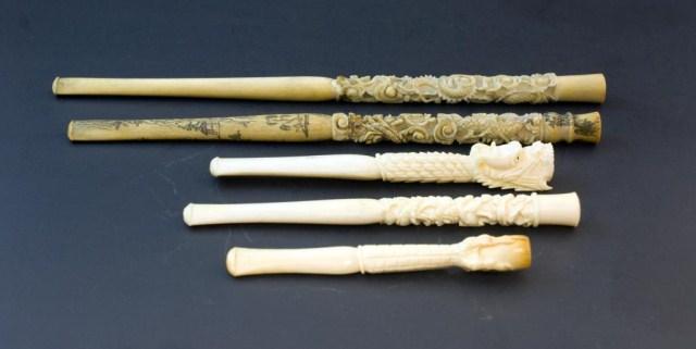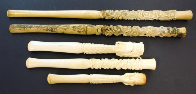 Each has a raised hand carved dragon design. One has an etched pavilion scene on the mouthpiece. Lengths are 3 5/8" 4 5/8" 5 1/8" 7 5/8" 8 3/8"