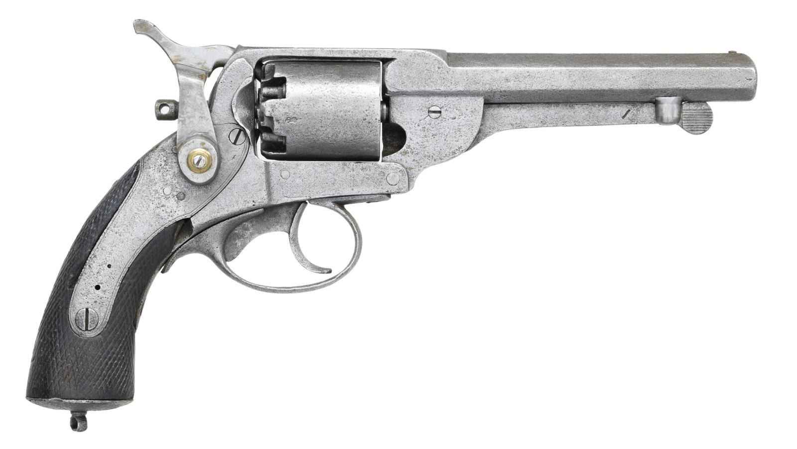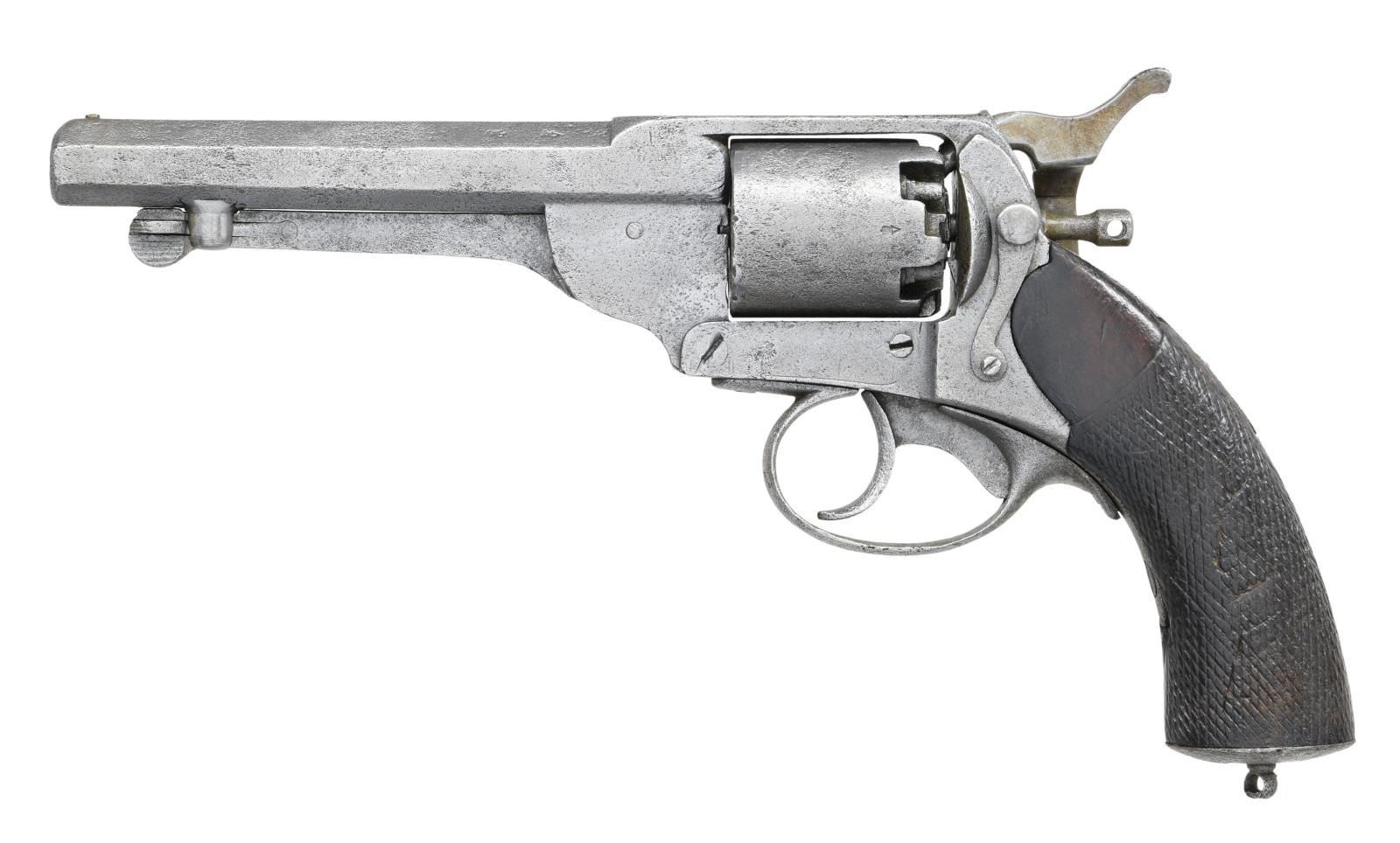 DOUBLE ACTION REVOLVER. Cal. 44. S# NSN. Bbl 5 - 3/4". Metal components are in-the-white, with the frame being mounted with a 1 piece checkered wood grip. Left side of barrel and cylinder bear British proofs. Other markings are no longer visible. Hammer screw is a replacement. CONDITION: metal components exhibit a cleaned pitted surface overall. Dark bore. Grip shows scattered marks and impressions from storage and handling overall. (01-23938/MLW). ANTIQUE. $300-500.