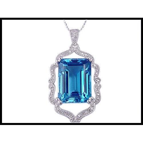 A superb London Blue natural topaz weighing over 21 carats is collection quality. It has the same hue as the finest aquamarines. As set in 14K solid white gold with 63 full cut diamonds, it is candy for the eye. Bold in scale, the pendant measures 20mm (13/16") x 40mm (1 1/2") long including the bale. No chain. It was fairly priced for only $1,400.00, and now may be yours for only a fraction of that.