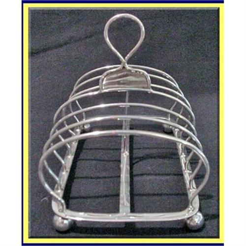 Rectangular base stands on 4 ball feet. Rounded corners with middle bar, on a smaller ball foot, for added support. 7 curved silver bars to hold 6 generous slices of toast (or waffles). In the center is a bar with a handle. The toaster is the epitomy of elegant simplicity and looks as wonderful today as it did almost 200 years ago.