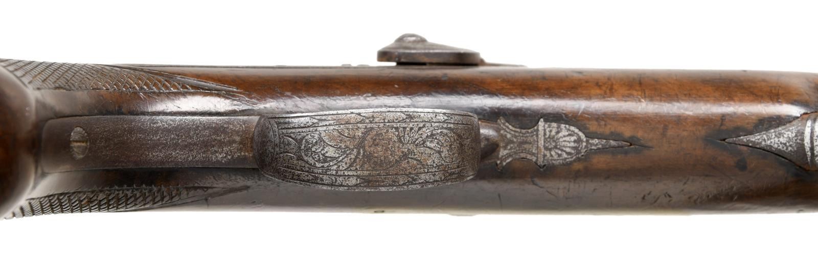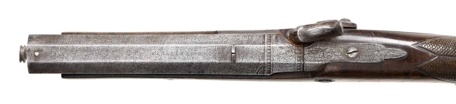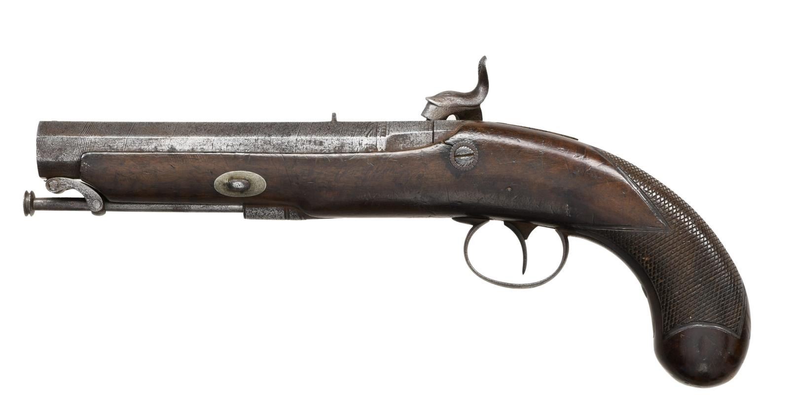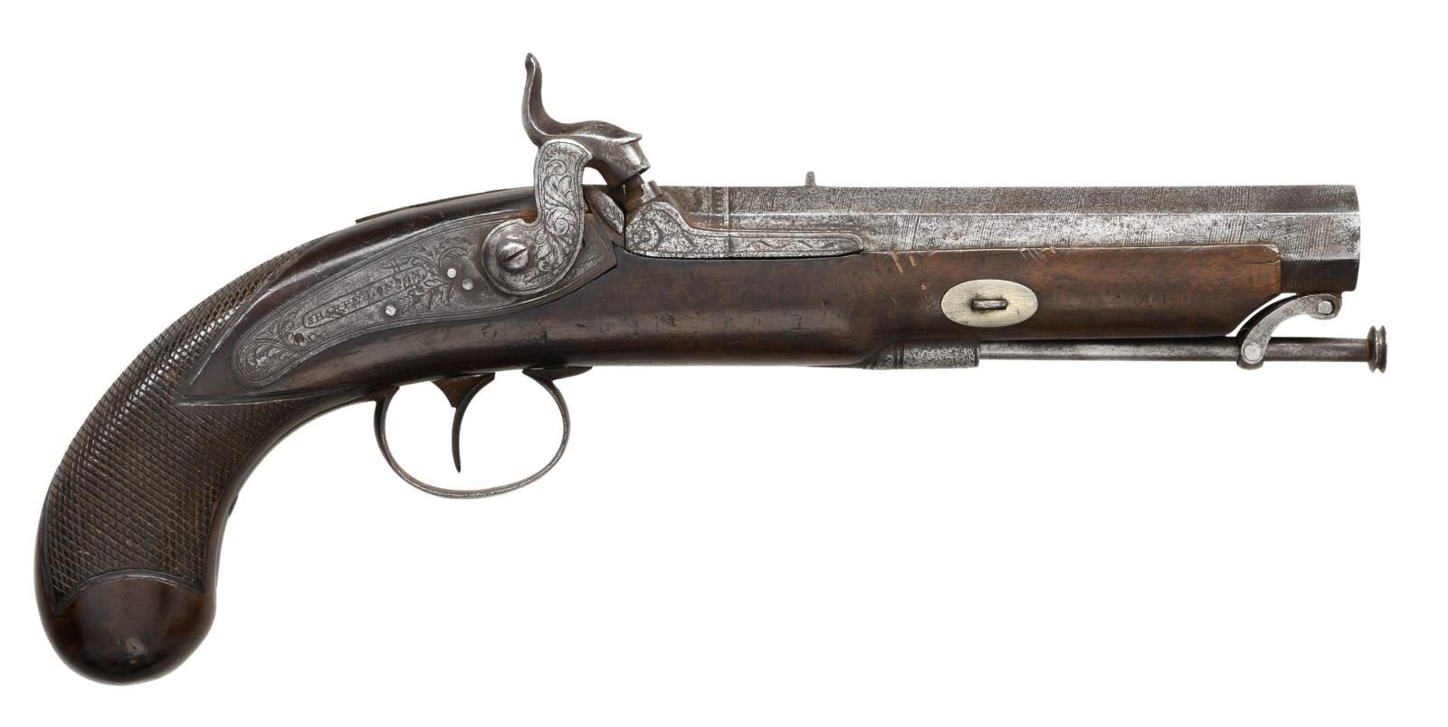 Cal. 60. NSN. Bbl. 6 3/4" of Twist steel showing Damascus pattern. Front sight has been almost flattened w/ high notch rear sight. Top of bbl. & lock marked "SHARPE LONDON". Back action hammer lock has highlights of scroll engraving that extend to hammer. Breech has triangle pattern border engraving. Wedge fastened walnut stock w/ spear finial triggerguard & checkered wrist. Bbl. has swivel ramrod. CONDITION: metal has a gray patina appearance w/ light pitting, marks & scratches. Stock has good varnish w/ numerous handling marks & a few sm. cracks. Bore shows unusual small groove rifling having pitting throughout. Hammer is able to hold at half & full cock; able to function when cycled by hand. (01-23522/MD). ANTIQUE. $500-800.