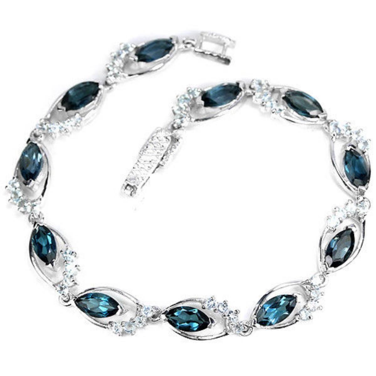 GENUINE AAA LONDON SKY BLUE TOPAZ 925 SILVER BRACELET 14K WHITE GOLD COATING; LENGTH OF ITEM (Inch.) 7.25 ; ITEM QUANTITY -1; STONE SHAPE -MARQUISE ROUND; STONE DIMENSION -8 X 4 MM. , 2 MM. ITEM WEIGHT -11.9 GRAM; COLOR -LONDON BLUE SKY BLUE; CLARITY -IF TO VVS; LUSTER -ENCHANTING; TREATMENT -IRRADIATION; ORIGIN OF STONE -AFRICA; HARDNESS -8;;