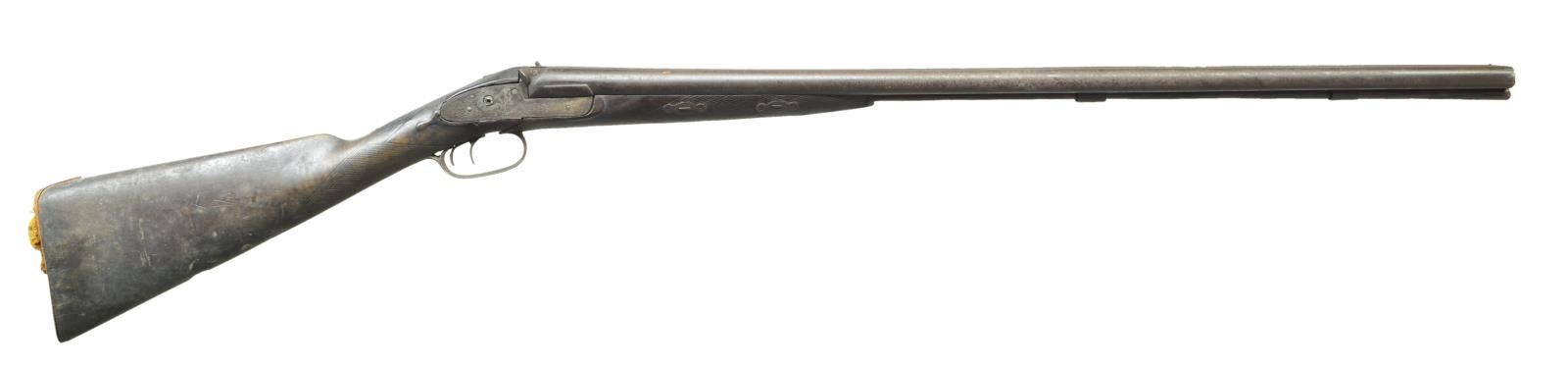 1) LONDON SXS PERCUSSION SHOTGUN WITH MANTON LOCKS CAl. 12 Ga. NSN. Bbls. 32" of London Laminated Steel w/ front bead. Side locks w/ scroll engraving marked "MANTON". Wedge fastened stock w/ checkering & metal buttplate. CONDITION: poor overall. Missing hammers. Patina pitted metal. Fair worn stock finish w/ break around trigger guard. Buttplate has leftover pad adhesive w/ oxidation. Nipples are flattened. Pitted bores. (01-20874/MD).