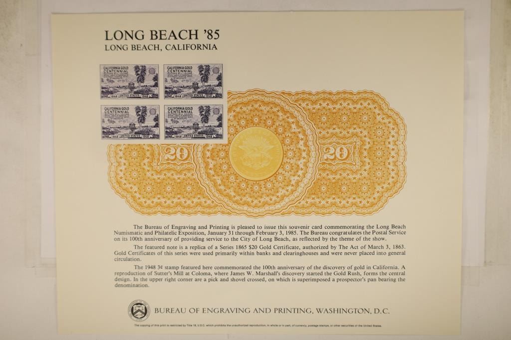 CARD FEATURING THE REVERSE OF AN 1865 SERIES $20 GOLD CERTIFICATE AND FOUR 1948 3 CENT STAMPS COMMEMORATING THE DISCOVERY OF GOLD IN CALIFORNIA