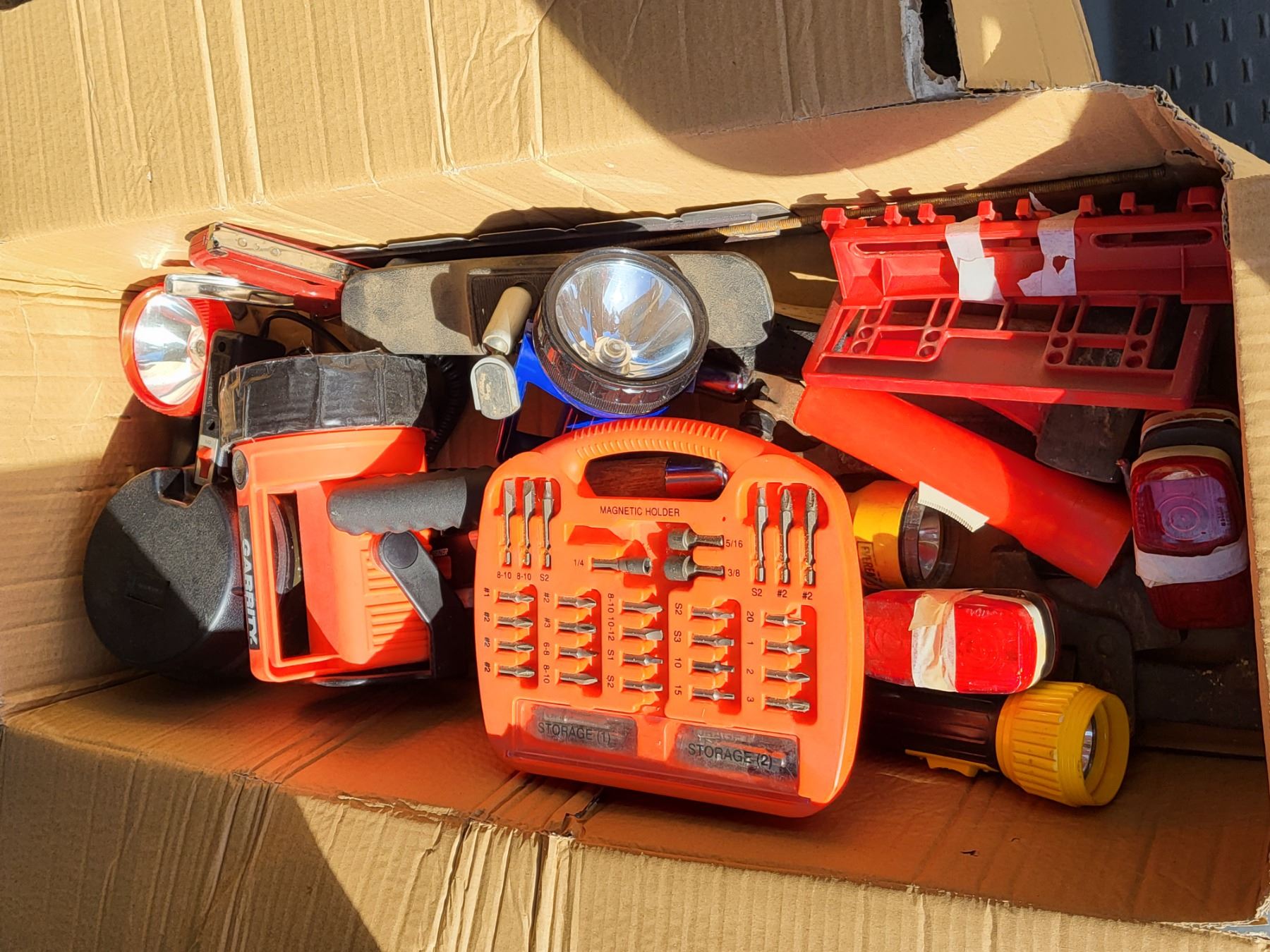 LONG BOX WITH VARIOUS TOOLS AND ACCESSORIES