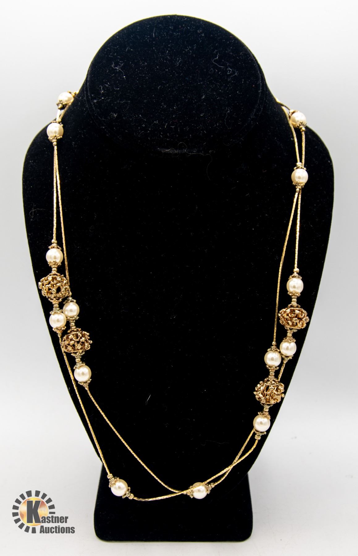 LONG GOLD TONE AND PEARL STYLE NECKLACE