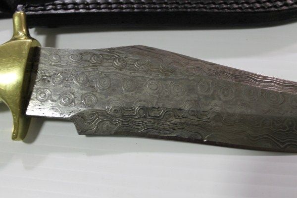 STAG HANDLE, BRASS HILT, DAMASCUS STYLE BLADE W/LEATHER SHEATH