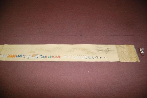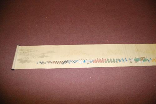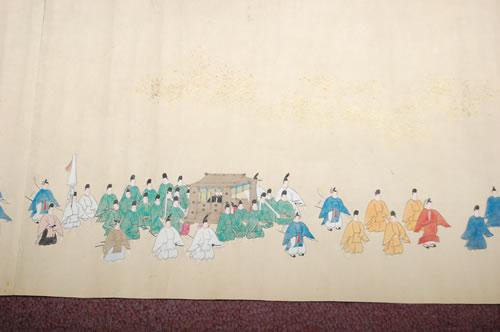 LONG JAPANESE HORIZONTAL SCROLL W/C-19TH CENT. SCROLL W/ 2 ROYAL PROCESSIONS OF SOLDIERS & PROVISIONS & THE WALLED CITIES ON EA. END-LABELED IN JAPANESE (18 FT.5" X 13")-LANCASTER COLLECTION, EX-MUSEUM, WEAR, SOILING, IMPERFECTIONS