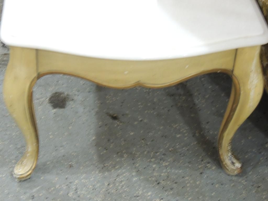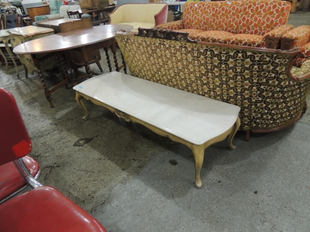 LONG MARBLE TOP COFFEE TABLE. FRENCH AS SHOWN. SEE PHOTO FOR MORE DETAILS.