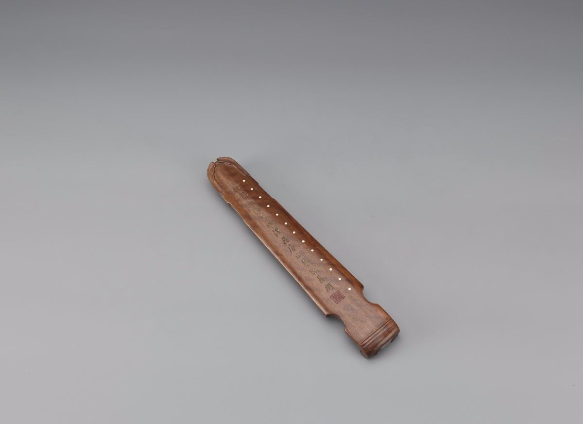 Chinese Brown color Longan Wood Guqin-shaped Scroll Weight, carved with a verse of calligraphic characters, red seal mark, raised on four inward arcs feet. Length 11.25" Width 1.75"