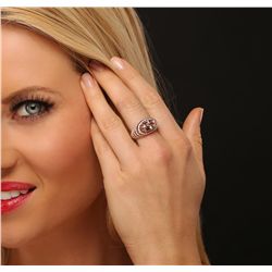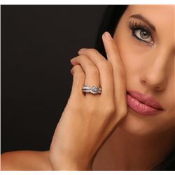 One electronically tested 18KT White Gold ladies cast diamond unity ring. The featured diamond is set within mirroring diamond ribbons supported by di