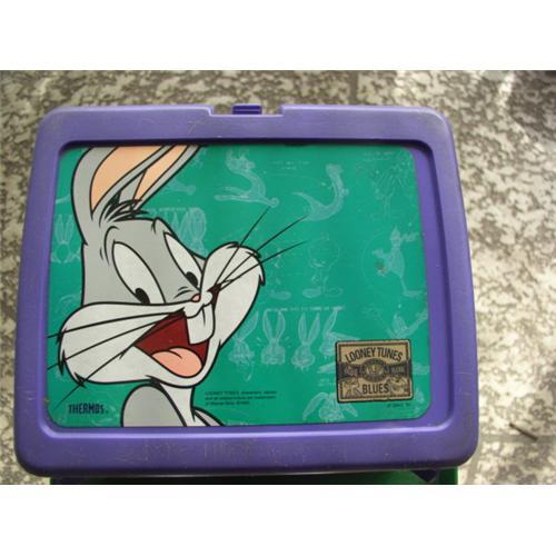 THE COLOR IS PURPLE WITH A WHITE HANDLE AND PURPLE LATCH. BUGS BUNNY IS FEATURED ON THE FRONT. NO THERMOS.