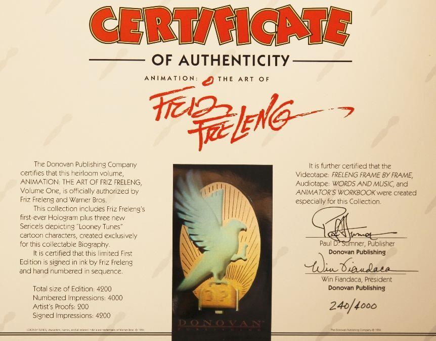 This highly collectible hard bound limited edition book, "Animation: The Art of Friz Freleng Volume One" with Friz Freleng with David Weber is numbered 240 of 4000 and describes Freleng's life and career, including many photos and reproductions of Freleng's work (Bugs Bunny, Daffy Duck, Road Runner, Elmer Fud, Porky Pig, Tweety Bird, Sylvester the Cat, Speedy Gonzales, and many more). The title page features the first and only hologram of the Looney Tunes characters Freleng ever designed and is hand signed by Freleng. The book comes packaged with "The Collection", an assortment of extras including a video tape "Freleng: Frame by Frame", an audio tape "Words and Music", a softcover book "Backstage with Friz and Co." and a numbered certificate of authenticity with a holographic seal. Published by Donovan Publishing in 1994. Comes in original packaging.