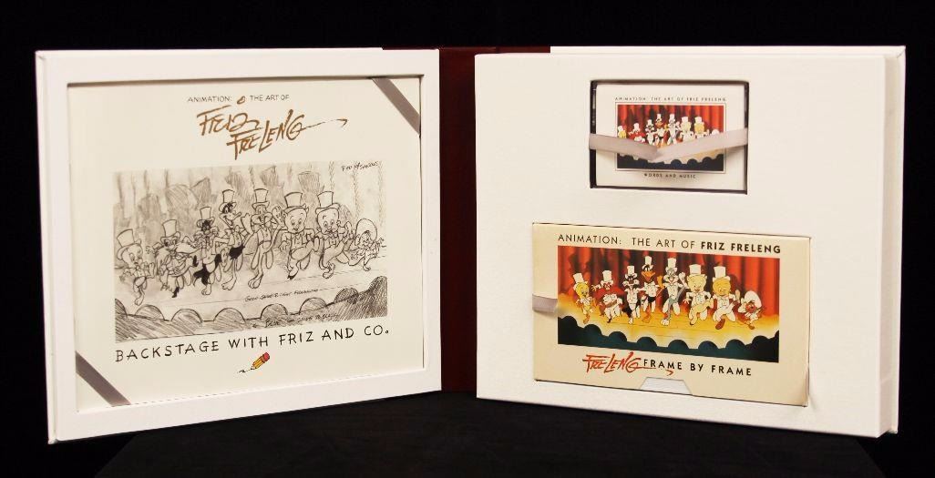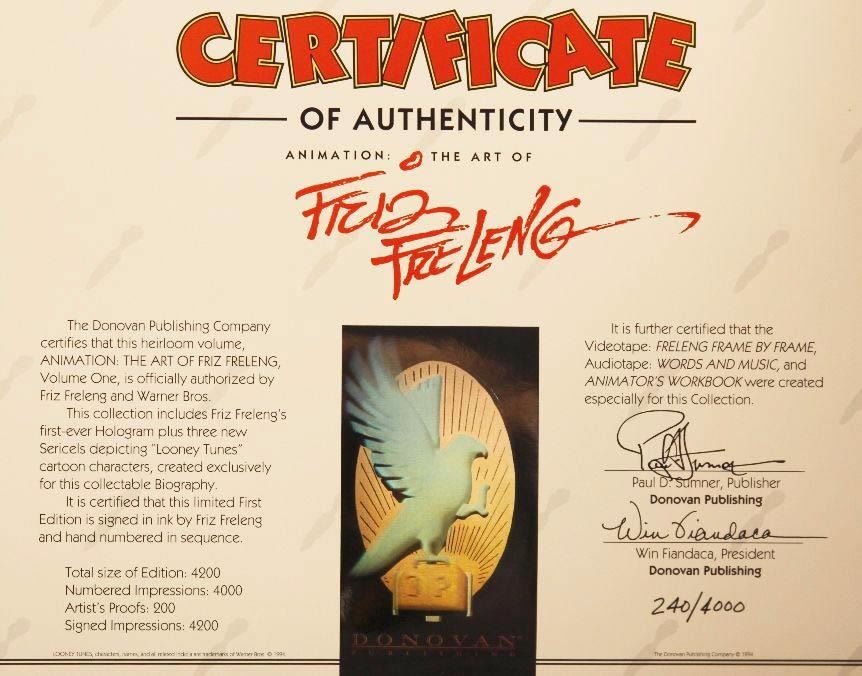 This highly collectible hard bound limited edition book, "Animation: The Art of Friz Freleng Volume One" with Friz Freleng with David Weber is numbered 240 of 4000 and describes Freleng's life and career, including many photos and reproductions of Freleng's work (Bugs Bunny, Daffy Duck, Road Runner, Elmer Fud, Porky Pig, Tweety Bird, Sylvester the Cat, Speedy Gonzales, and many more). The title page features the first and only hologram of the Looney Tunes characters Freleng ever designed and is hand signed by Freleng. The book comes packaged with "The Collection", an assortment of extras including a video tape "Freleng: Frame by Frame", an audio tape "Words and Music", a softcover book "Backstage with Friz and Co." and a numbered certificate of authenticity with a holographic seal. Published by Donovan Publishing in 1994. Comes in original packaging.