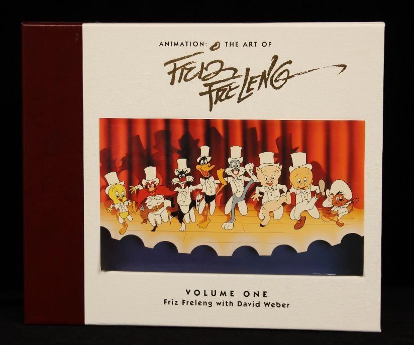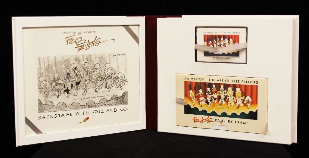 This highly collectible hard bound limited edition book, "Animation: The Art of Friz Freleng Volume One" with Friz Freleng with David Weber is numbered 3672 of 4000 and describes Freleng's life and career, including many photos and reproductions of Freleng's work (Bugs Bunny, Daffy Duck, Road Runner, Elmer Fud, Porky Pig, Tweety Bird, Sylvester the Cat, Speedy Gonzales, and many more). The title page features the first and only hologram of the Looney Tunes characters Freleng ever designed and is hand signed by Freleng. The book comes packaged with "The Collection", an assortment of extras including a video tape "Freleng: Frame by Frame", an audio tape "Words and Music", a softcover book "Backstage with Friz and Co." and a numbered certificate of authenticity with a holographic seal. Published by Donovan Publishing in 1994. Comes in original packaging.