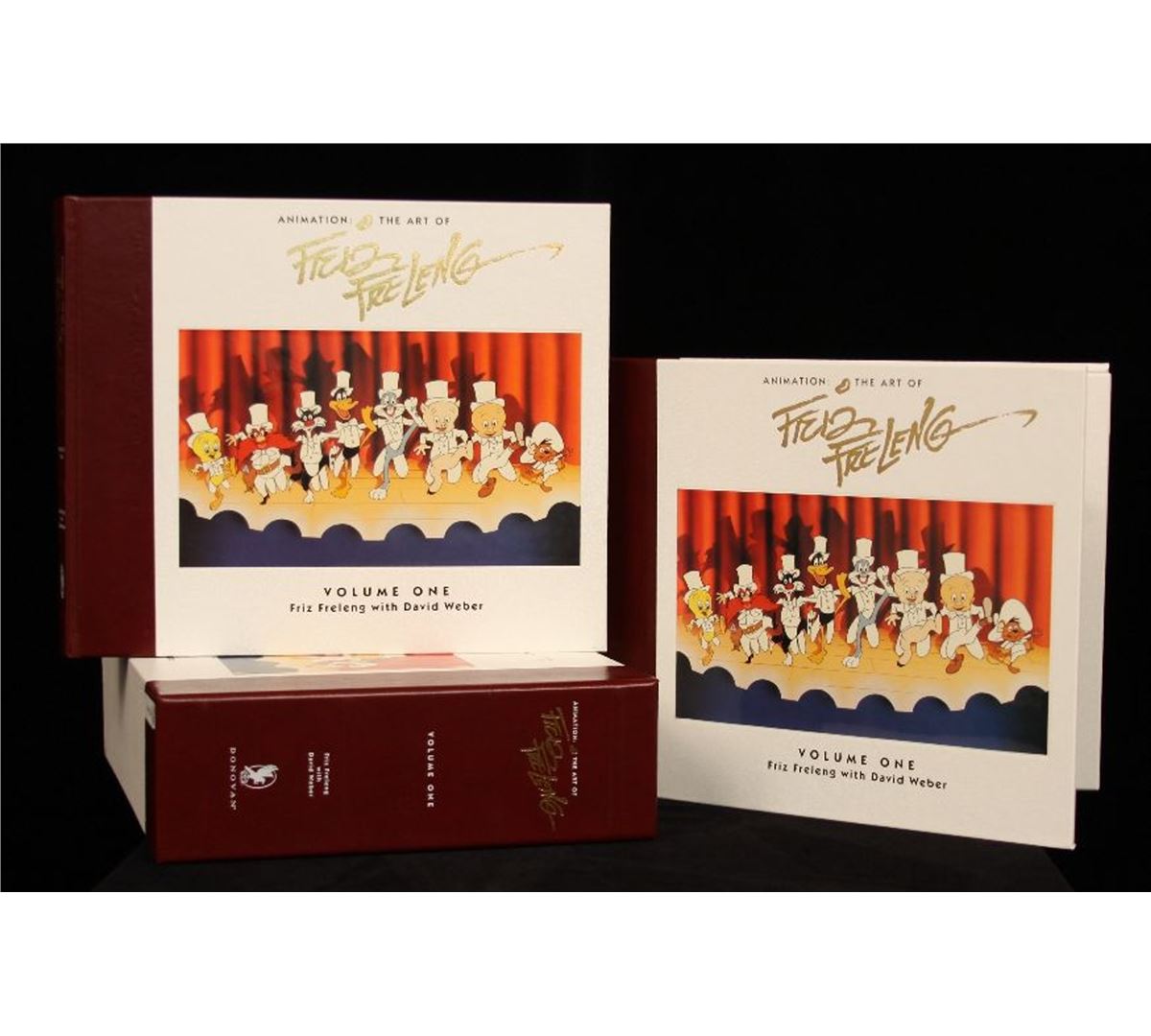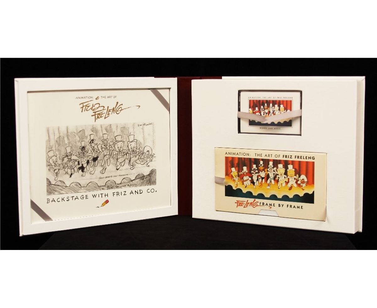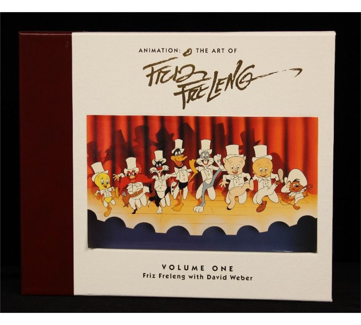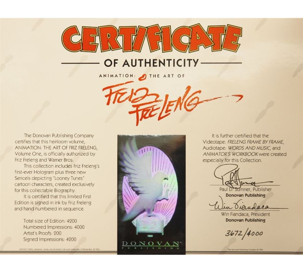 This highly collectible hard bound limited edition book, "Animation: The Art of Friz Freleng Volume One" with Friz Freleng with David Weber is numbered 3672 of 4000 and describes Freleng's life and career, including many photos and reproductions of Freleng's work (Bugs Bunny, Daffy Duck, Road Runner, Elmer Fud, Porky Pig, Tweety Bird, Sylvester the Cat, Speedy Gonzales, and many more). The title page features the first and only hologram of the Looney Tunes characters Freleng ever designed and is hand signed by Freleng. The book comes packaged with "The Collection", an assortment of extras including a video tape "Freleng: Frame by Frame", an audio tape "Words and Music", a softcover book "Backstage with Friz and Co." and a numbered certificate of authenticity with a holographic seal. Published by Donovan Publishing in 1994. Comes in original packaging.
