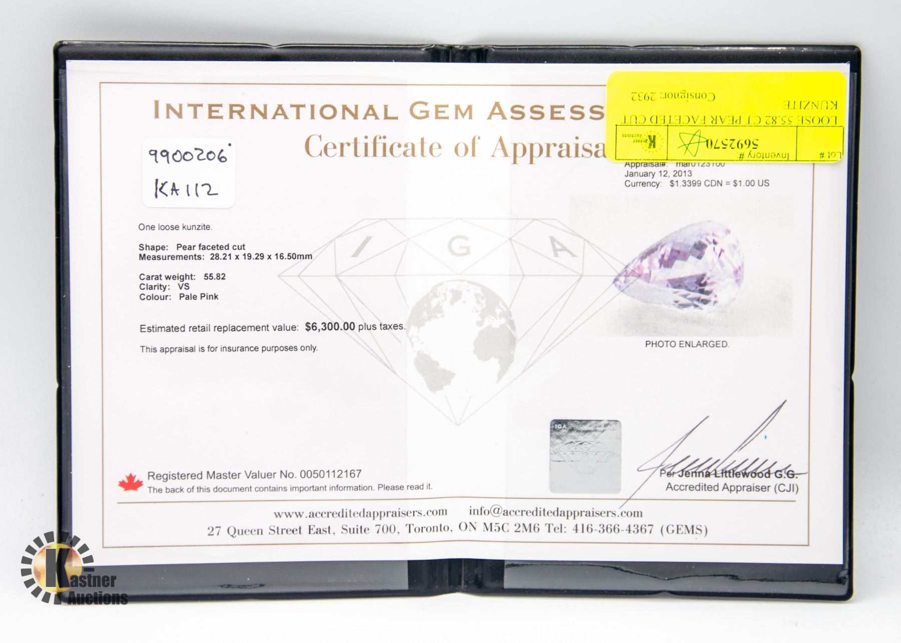 MEASURING 28.21 X 19.29 X 16.50MM, CLARITY IS VS COLOR IS PALE PINK. COMES WITH APPRAISAL FROM INTERNATIONAL GEM ASSESSMENT INC (MAR0123100) APPRAISED VALUE $6,300.00 **ALL ITEMS MUST BE REMOVED BY 5PM SATURDAY, SEPTEMBER 9TH 2023. ALL REMAINING ITEMS WILL BE SUBJECT TO A $6.00 PER DAY STORAGE CHARGE. ANY ITEMS REMAINING AFTER MONDAY, SEPTEMBER 25TH, 2023 WILL BE CONSIDERED FORFEITED. NO REFUNDS WILL BE ISSUED FOR FORFEITED ITEMS. TO SCHEDULE A PICK UP APPOINTMENT CLICK HERE