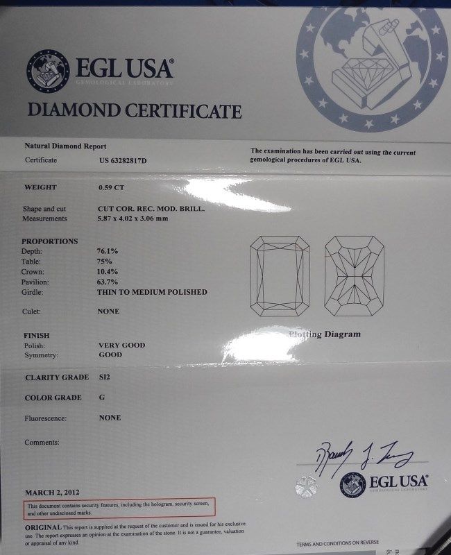 SHAPE: Cut Corner Rectangular Modified Brilliant. Appraisal Summary from Universal Gemological Services states retail replacement value as $2120.00