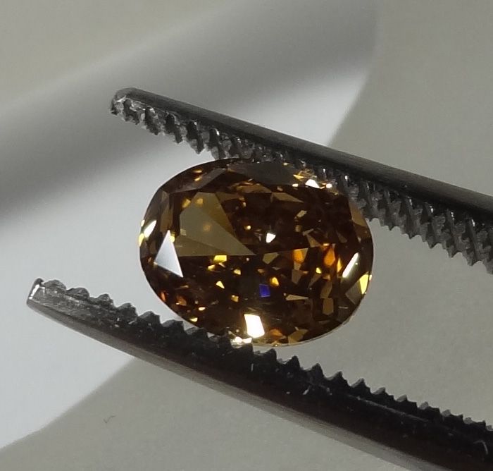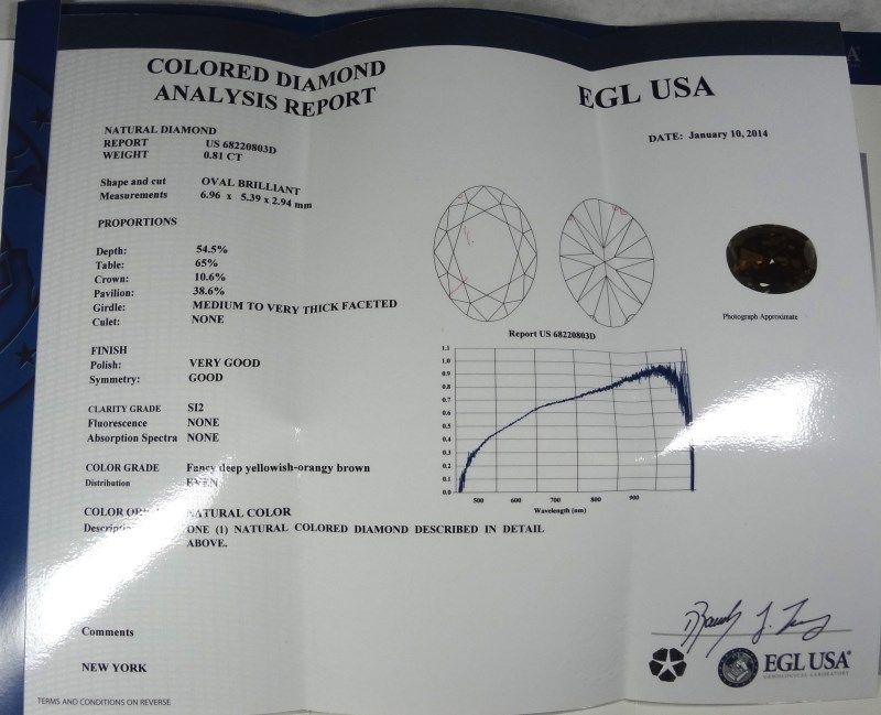 COLOR: Fancy Deep yellowish Orangy Brown. Appraisal Summary from Universal Gemological Services states retail replacement value as $3390.00 This is a very masculine looking diamond and would look great in a gent's ring!