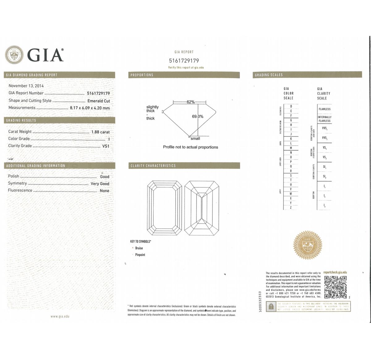 LOOSE STONE: [1] 1.88ct Emerald cut diamond, VS1, I color, 8.17 x 6.09 x 4.20 mm, Good/Very Good. GIA # 5161729179