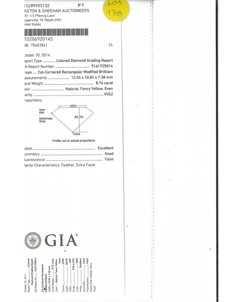 LOOSE STONE: [1] 8.76ct Cut-cornered rectangular modified brilliant diamond. VVS2 clarity, natural, fancy yellow, even color, 12.04 x 10.81 x 7.38 mm, excellent/good/faint. GIA # 5161725014
