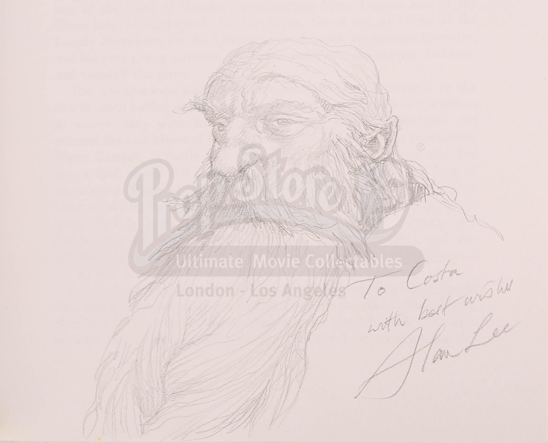 The books are third-edition paperbacks depicting Alan Lee's printed illustrations on the covers and throughout, and each volume features an intricate hand-drawn illustration and autograph. The Fellowship of the Ring's illustration depicts Gandalf smoking a pipe, The Two Towers' illustration depicts Gimli the dwarf, and The Return of the King's depicts Mount Doom. The books show minimal wear from use, the pages display minor edge wear, and the spines show creases. Dimensions: 25.5 cm x 17 cm x 10 cm (10" x 6 3/4" x 4")
