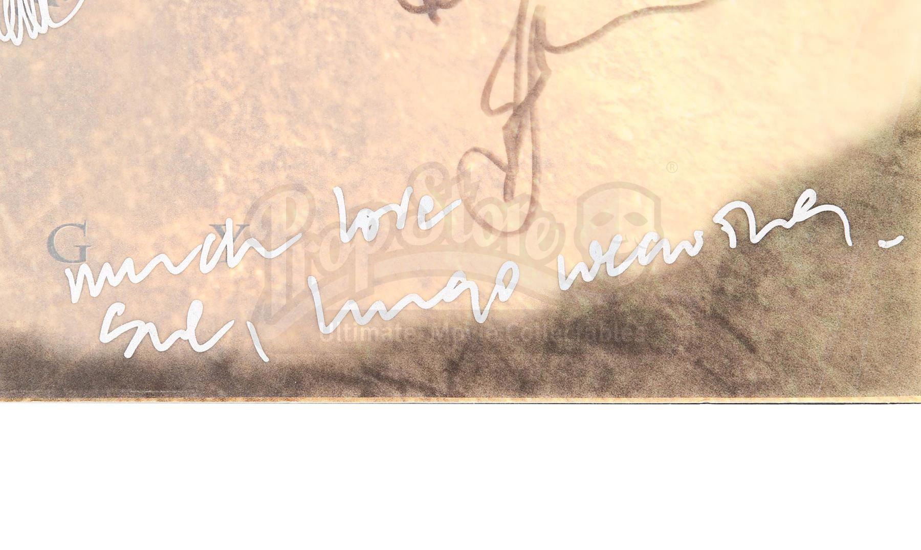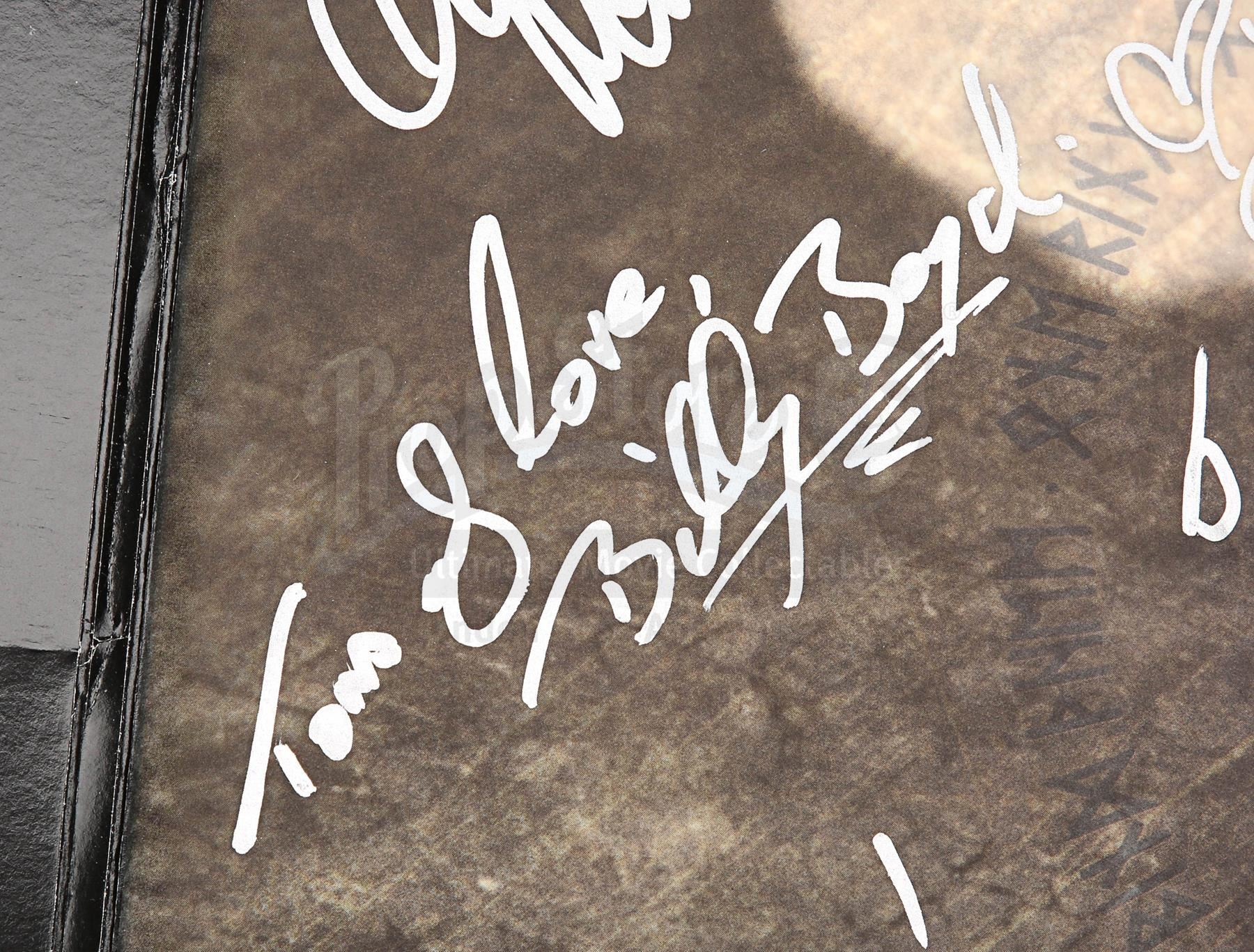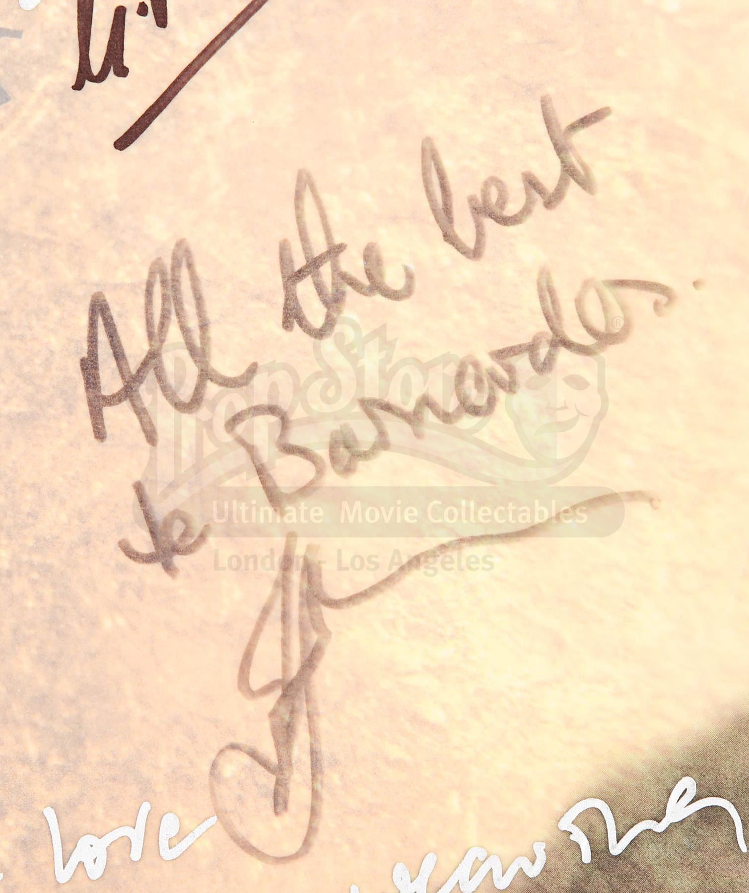The Gothic-style card cover opens to reveal a translucent page covered with key cast autographs, including Elijah Wood and Ian McKellen, that is dedicated to "Sue" and "Barnardos", a UK children's charity. The pages inside contain key snippets of information and conceptual images, including a reference to the launch of the film's official website in May 1999. The cover page features the film's original logo. Some pages have creases and the card cover is foxed. Dimensions: 0.5 cm x 41 cm x 30.5 cm (1/4" x 16" x 12")