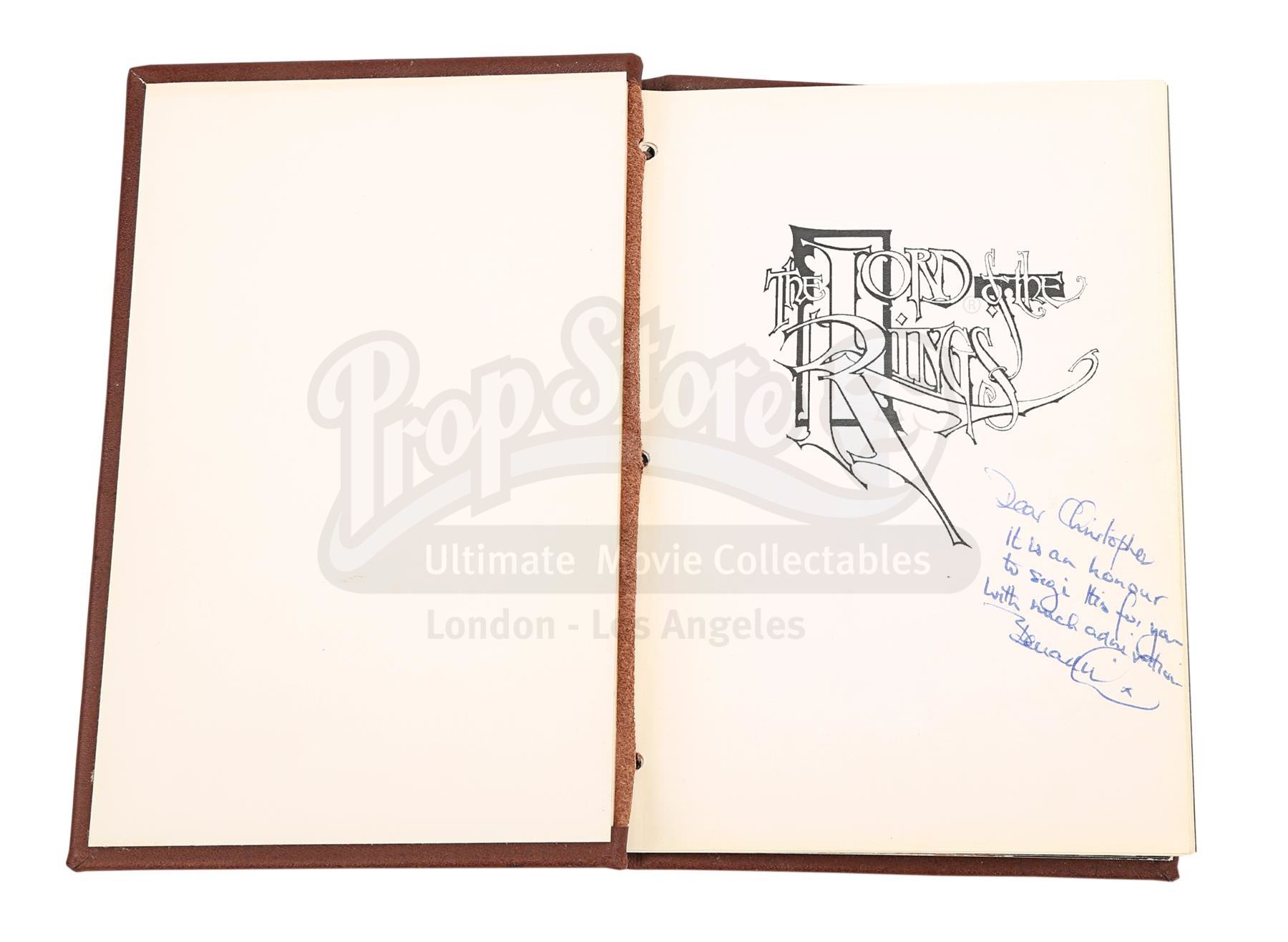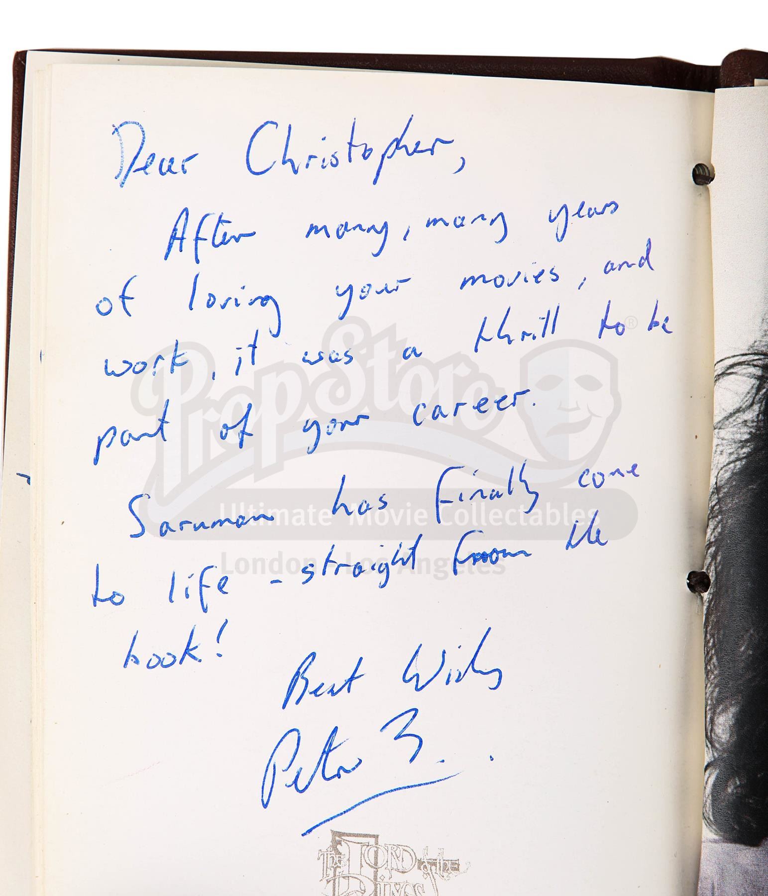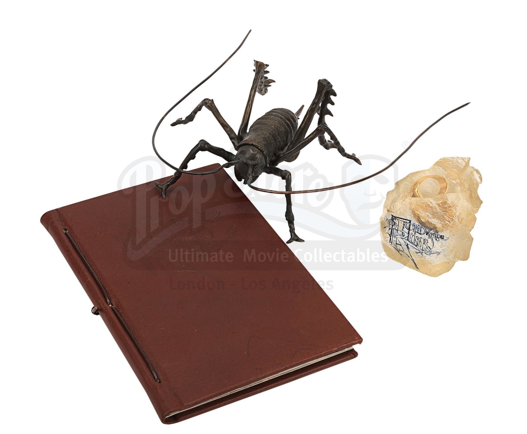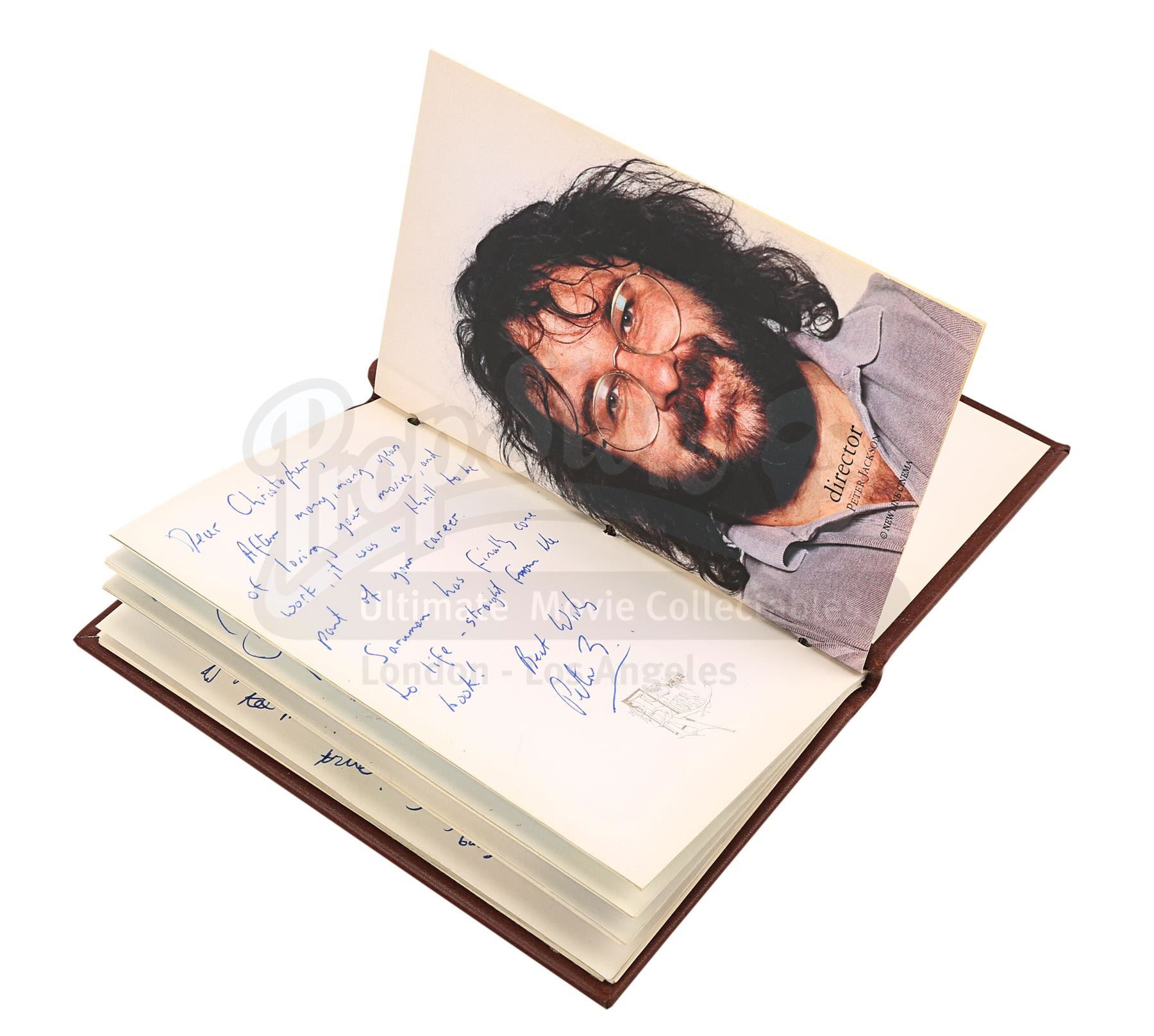 A notebook autographed by Peter Jackson and cast, promotional One Ring and weta bug from the making of Peter Jackson's adaptation of J.R.R. Tolkien's fantasy epic The Lord of the Rings. These lots were acquired directly from the estate of the late screen legend Sir Christopher Lee, who portrayed the dark wizard Saruman in the films.