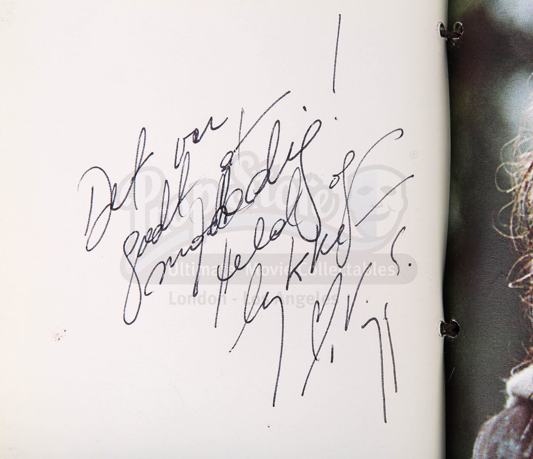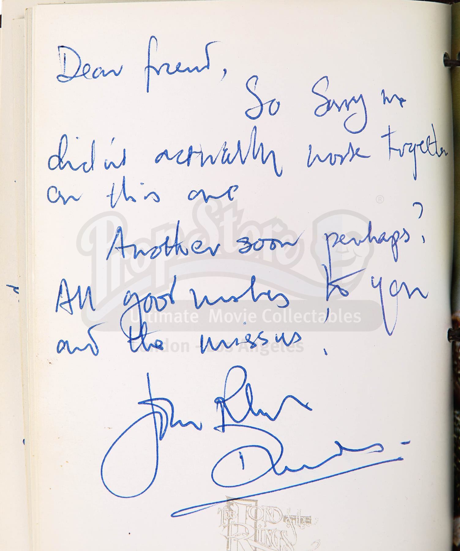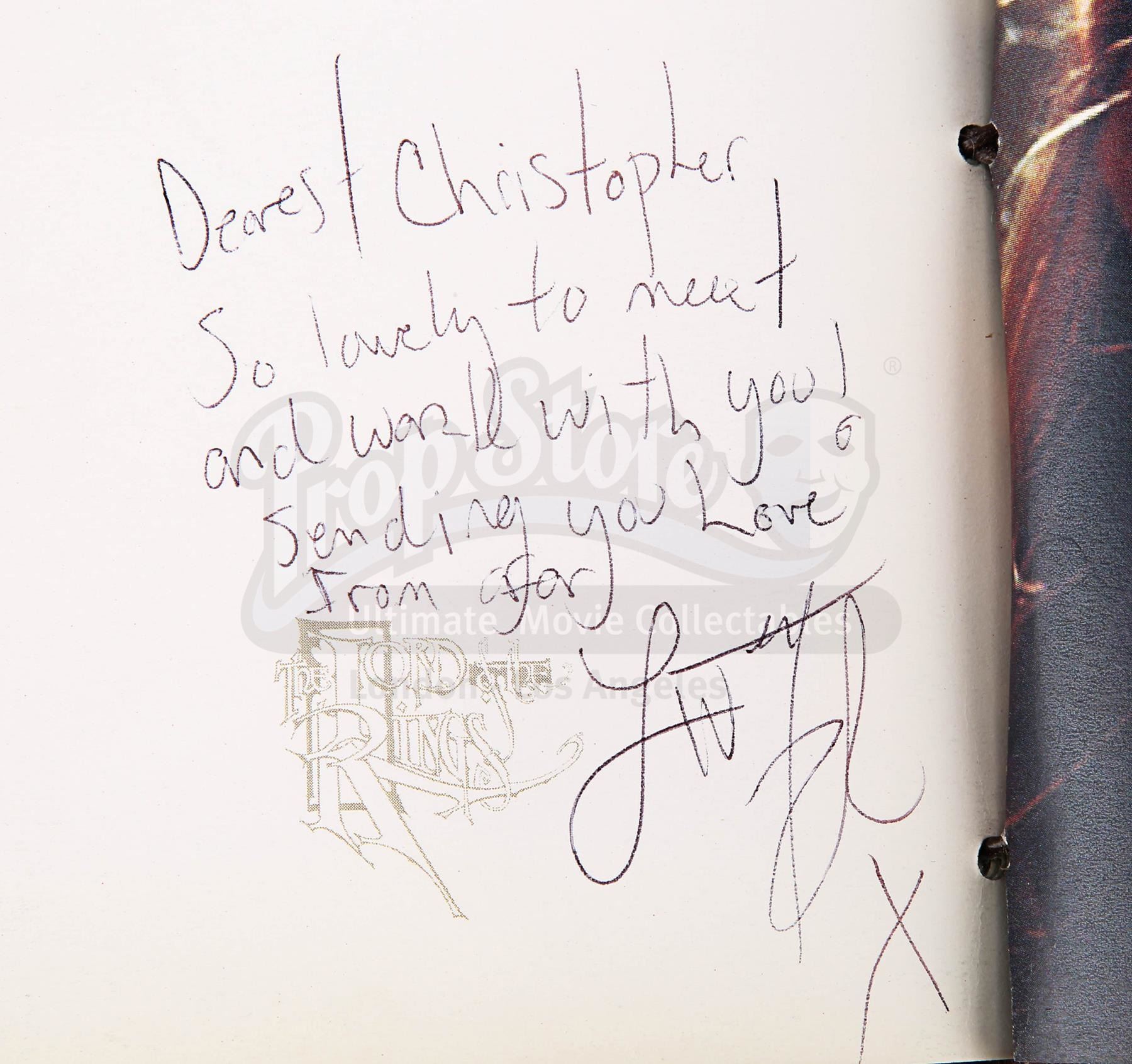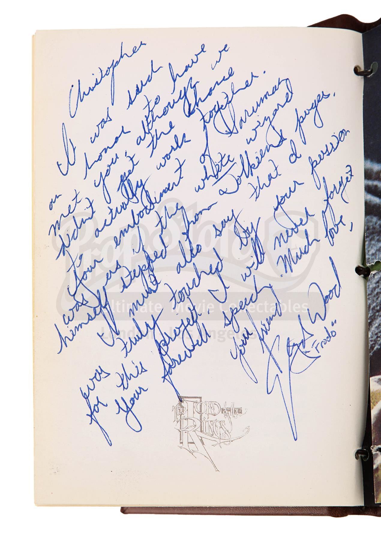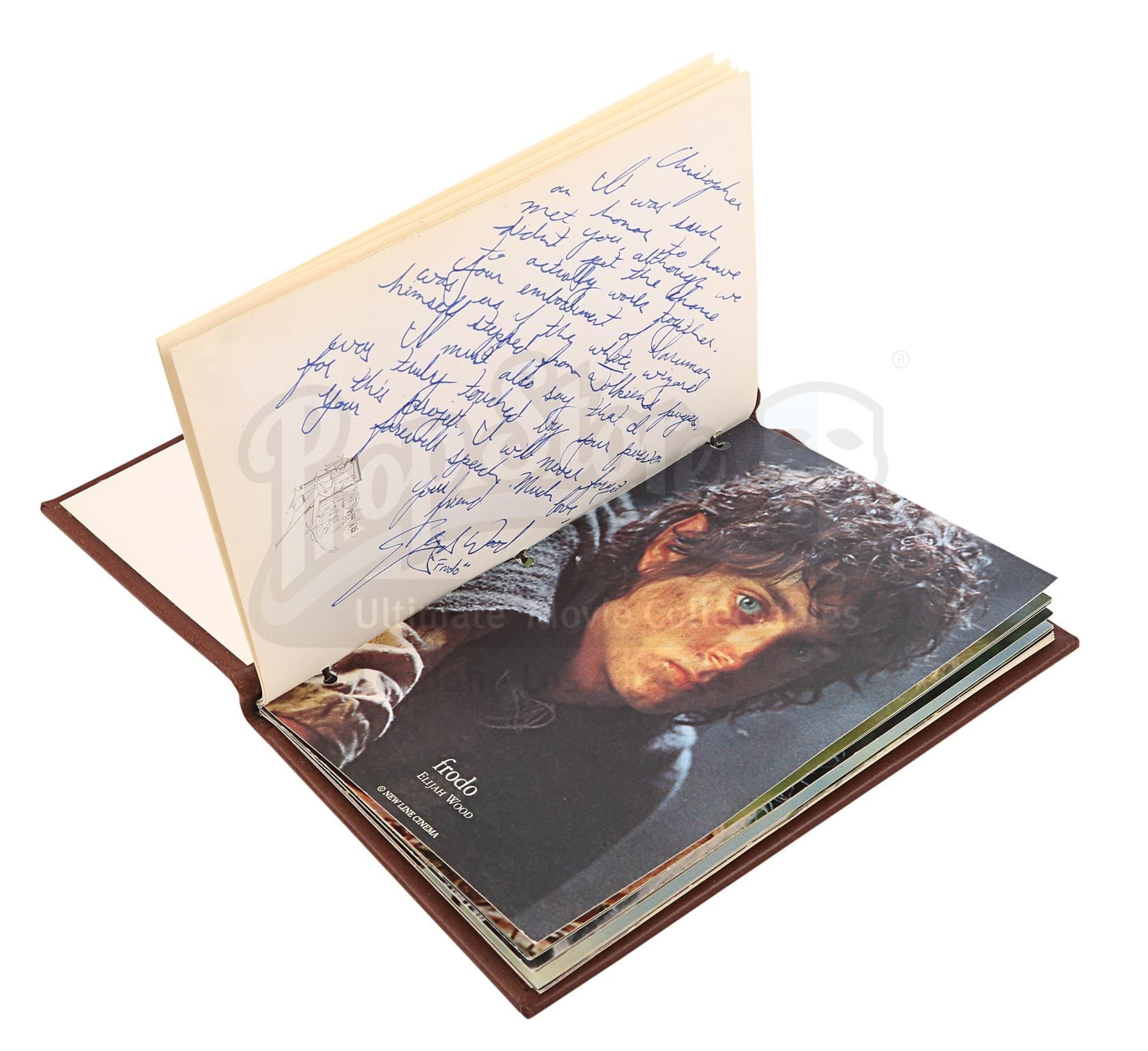 A notebook autographed by Peter Jackson and cast, promotional One Ring and weta bug from the making of Peter Jackson's adaptation of J.R.R. Tolkien's fantasy epic The Lord of the Rings. These lots were acquired directly from the estate of the late screen legend Sir Christopher Lee, who portrayed the dark wizard Saruman in the films.