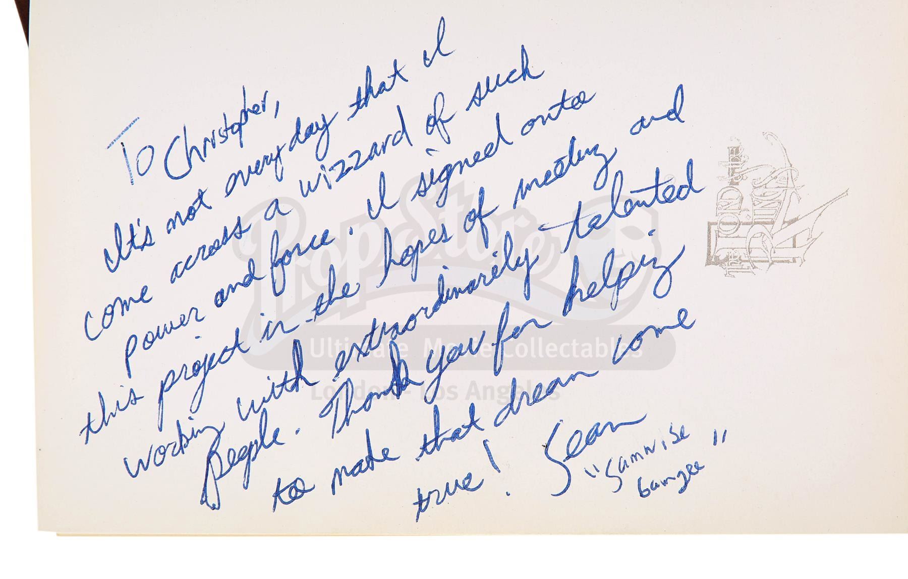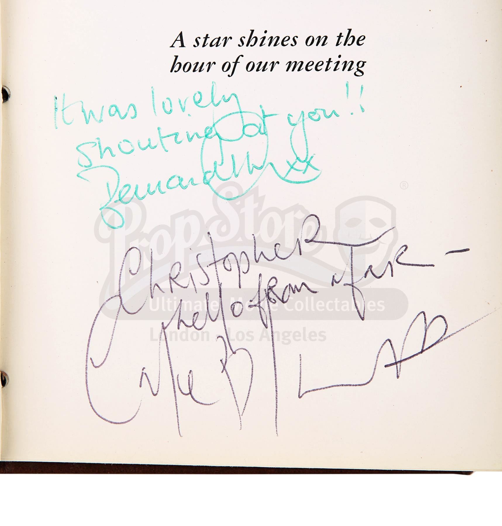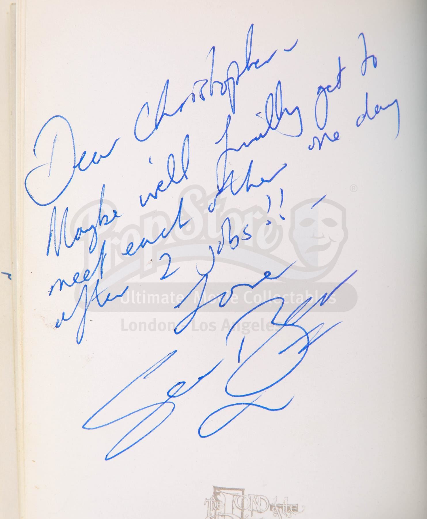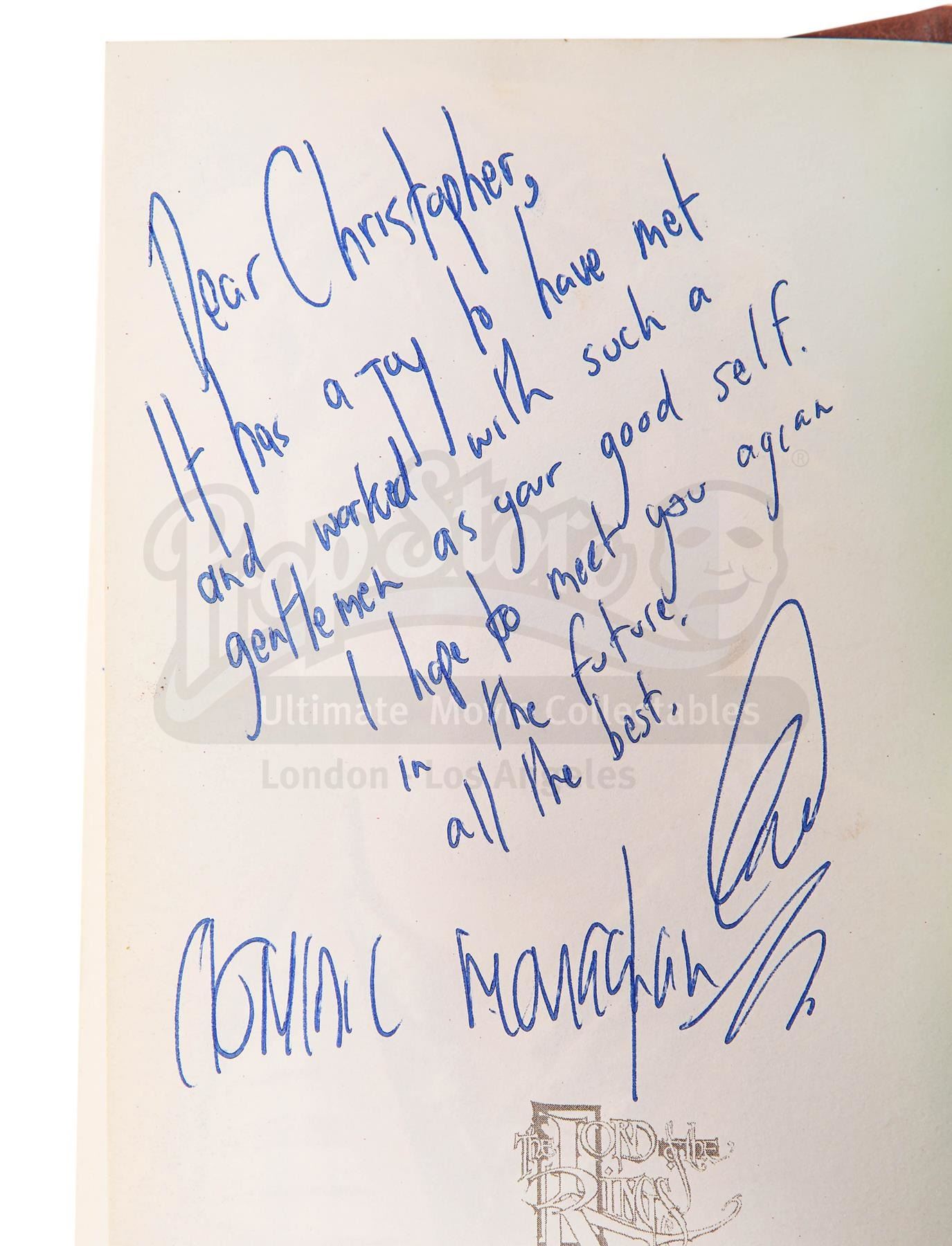 A notebook autographed by Peter Jackson and cast, promotional One Ring and weta bug from the making of Peter Jackson's adaptation of J.R.R. Tolkien's fantasy epic The Lord of the Rings. These lots were acquired directly from the estate of the late screen legend Sir Christopher Lee, who portrayed the dark wizard Saruman in the films.