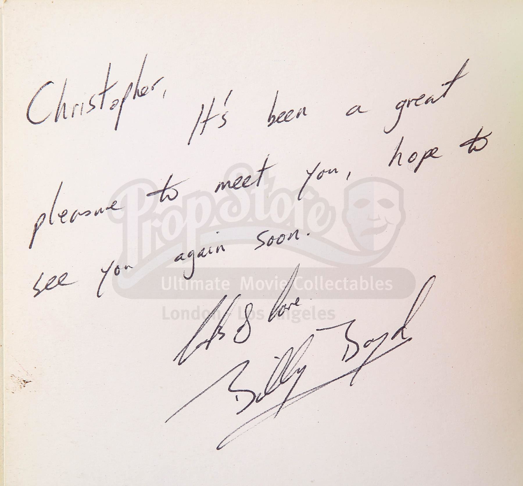 11.2. In the catalogue descriptions, Prop Store takes steps to identify and provide provenance for Lots offered at auction. In many cases, the Lots offered were used in or in conjunction with motion pictures or other programmes and information is furnished in order to fully identify and describe the Lot offered at Auction, including photographs and illustrations. Prop Store in no way claims any connection to or relationship with the producers of the motion picture or other programme. In all cases, the use of the titles or other elements of a motion picture or other programme is for informational purposes only.