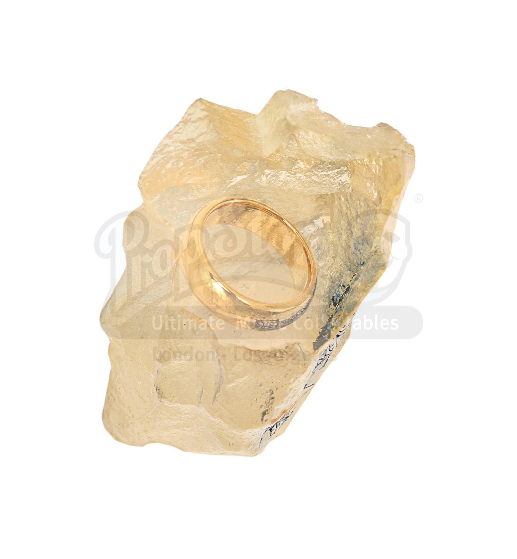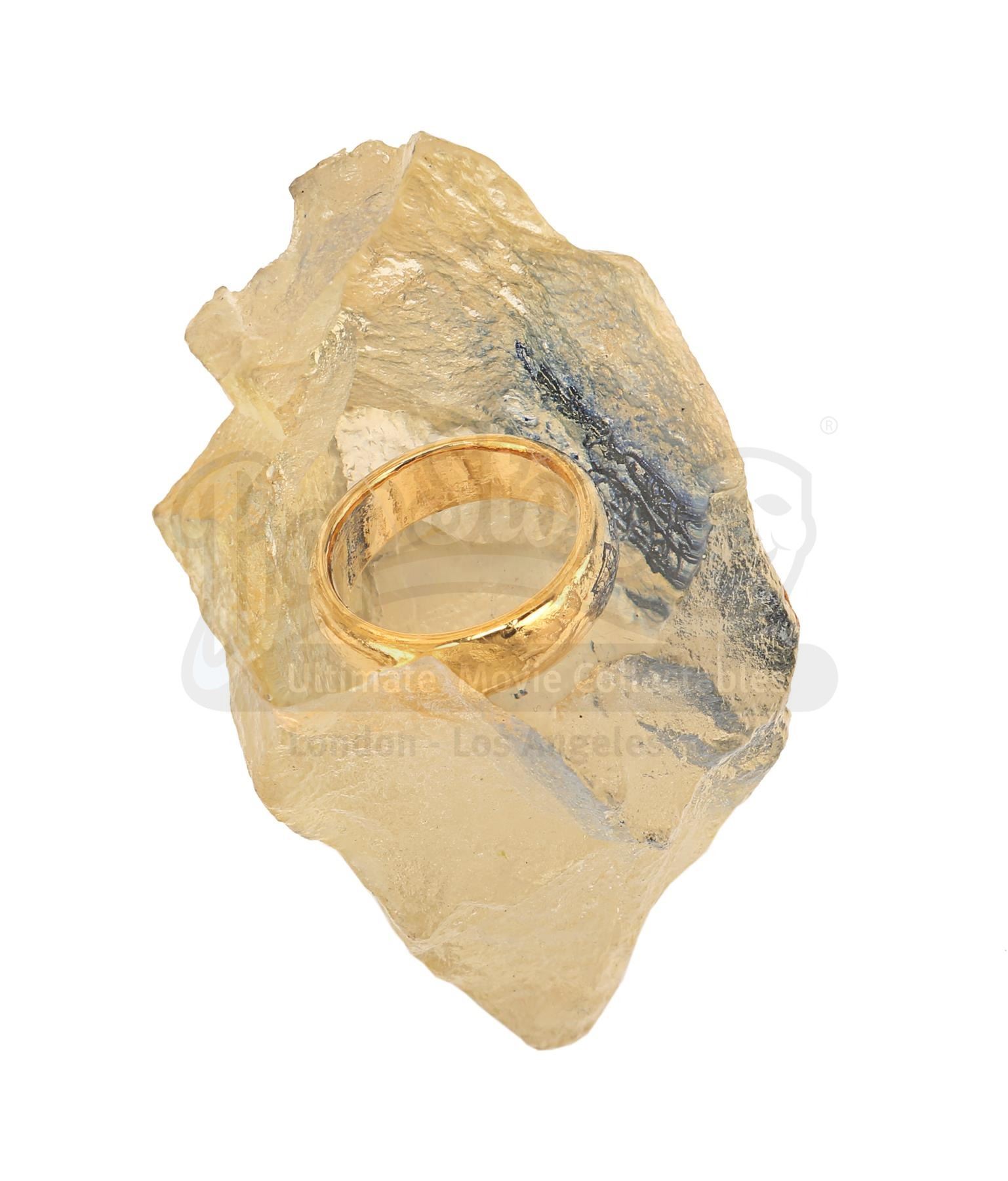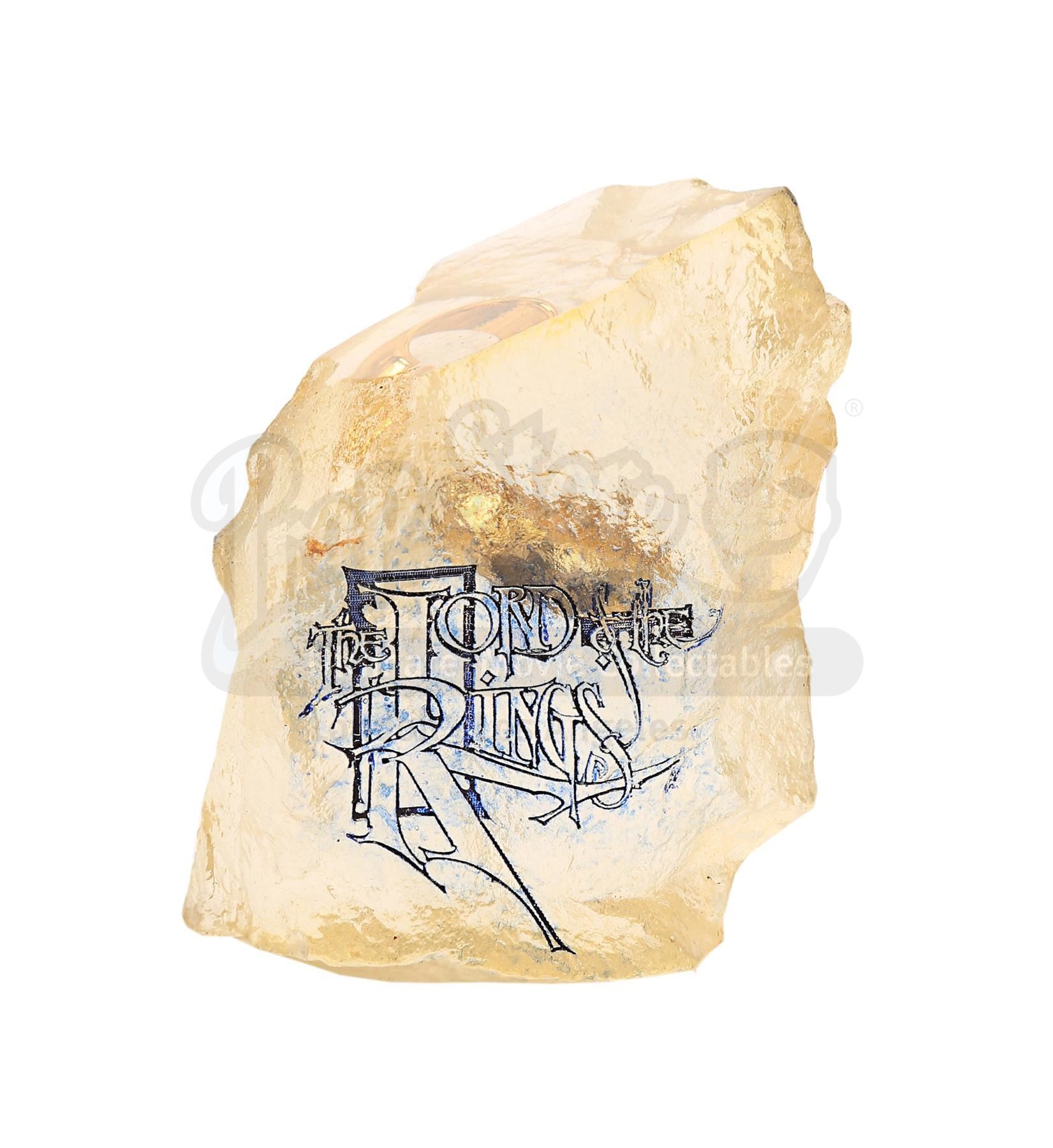 The small leather-bound booklet features an early title logo design embossed on the cover, and contains the film synopsis, with postcards of key cast members, all of whom have written extensive, heartfelt personal messages to Lee. The promotional One Ring is encased within a clear acrylic €˜rock' with one highly polished face, and the prototype logo is engraved and highlighted in ink. The 1:1 scale weta bug €†mascot of New Zealand-based special effects company Weta Workshop €†is cast in brass. There is a hole in the base where a rod once supported it. The acrylic has yellowed with age and the book has some wear and ink marks from signing. Dimensions (book): 16 cm x 11 cm x 1 cm (6 1/4" x 4 1/4" x 1/4"); (ring): 4 cm x 6 cm x 7 cm (1 1/2" x 2 1/4" x 2 3/4"); (weta): 20 cm x 15 cm x 6 cm (8" x 6" x 2 1/2").