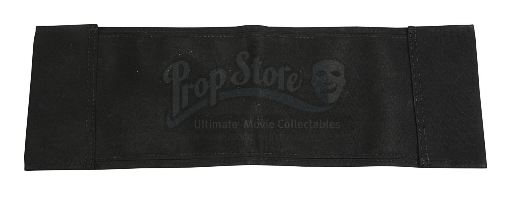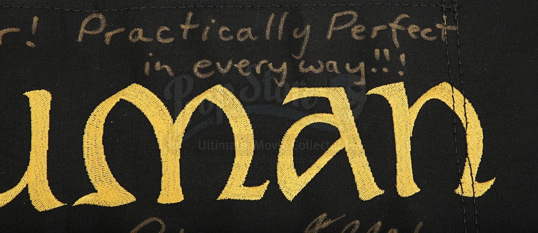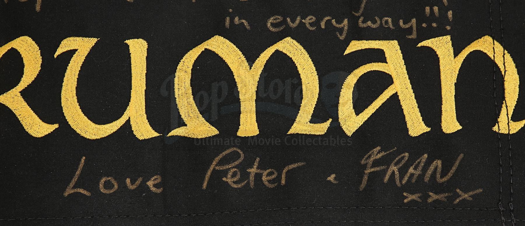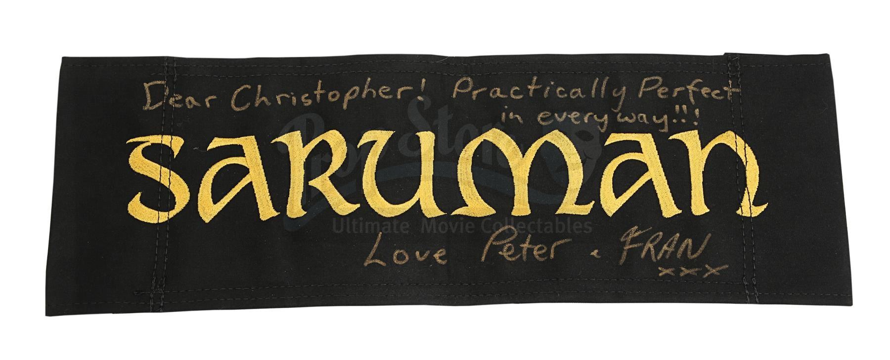 Made from thick black fabric, the back has Lee's character name "Saruman" embroidered in metallic yellow thread in a font synonymous with the films. Written around the name is a dedication from director Peter Jackson, signed by Jackson and his wife and producer Fran Walsh, reading "Dear Christopher! Practically Perfect in every way!!! Love Peter + FRAN xxx". It remains in very good condition. Dimensions: 53 cm x 17 cm (21" x 6 3/4").