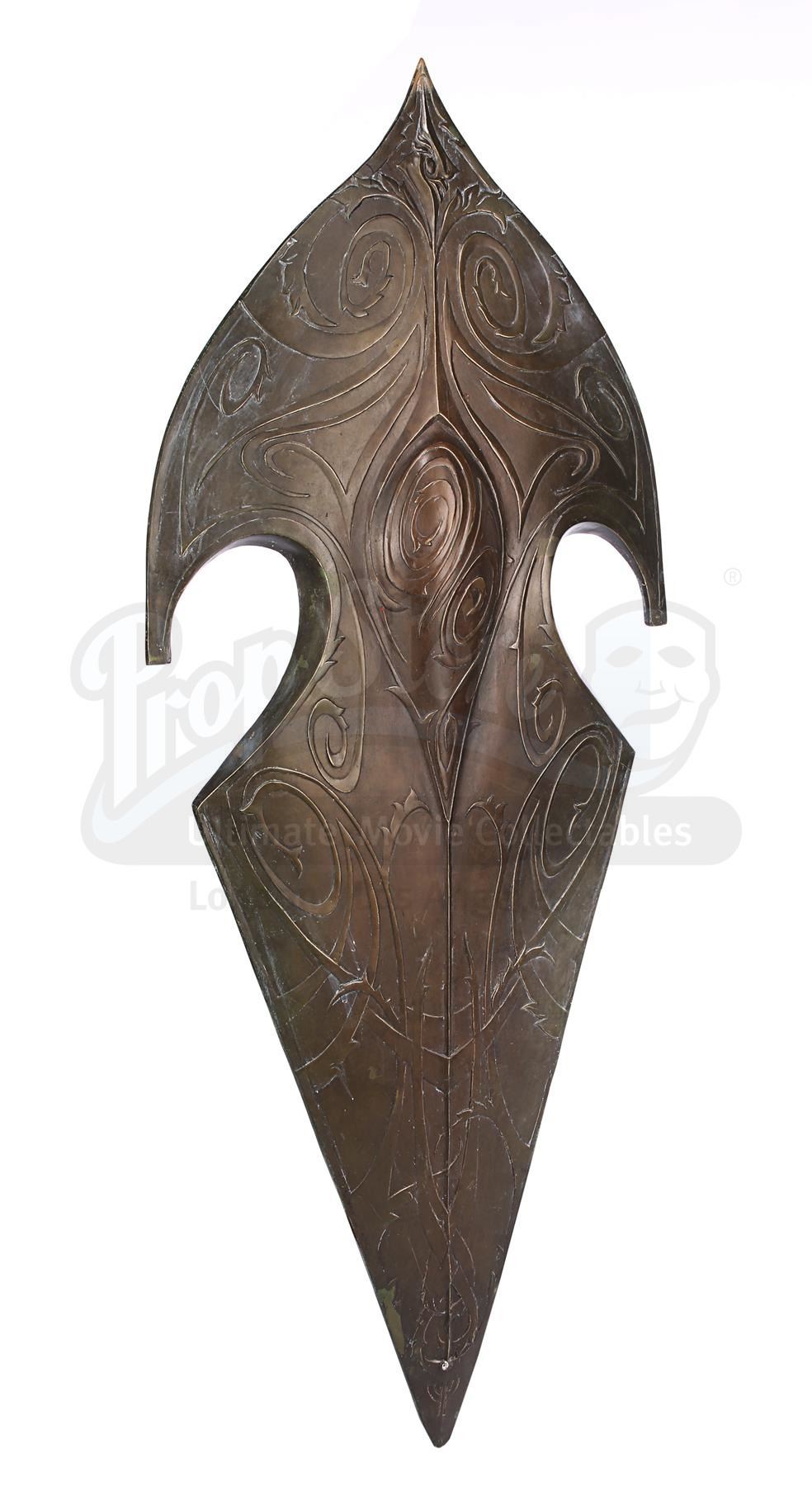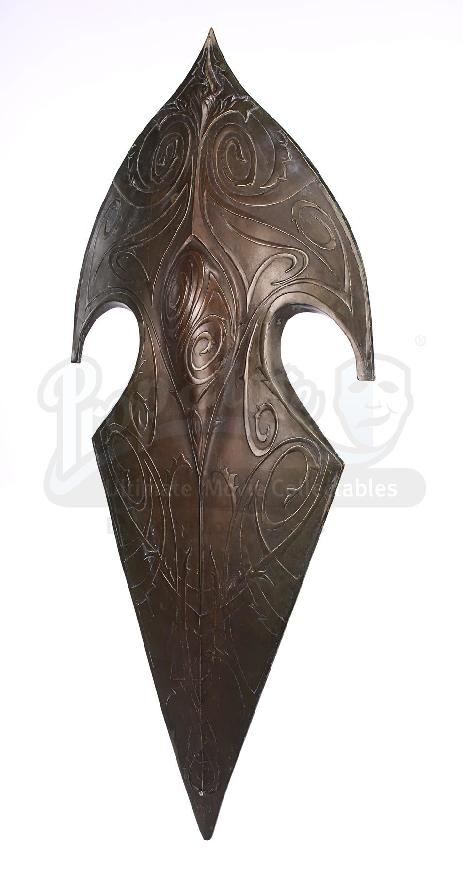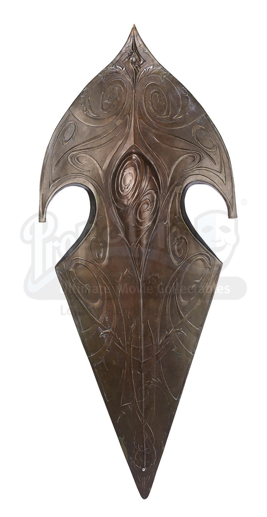 An Elven shield from Peter Jackson's adaptation of J.R.R. Tolkien's fantasy epic The Lord of the Rings. The Elven army carried shields during the film's prologue, in which the Last Alliance of Elves and Men fought against the Dark Lord Sauron (Sala Baker) and his forces at the foot of Mount Doom. Created by the artists at Weta Workshop in New Zealand, under the direction of Multi-Academy Award-winner Richard Taylor, the shield was part of a collection issued to United Cutlery for reference in producing a replica version for fans.