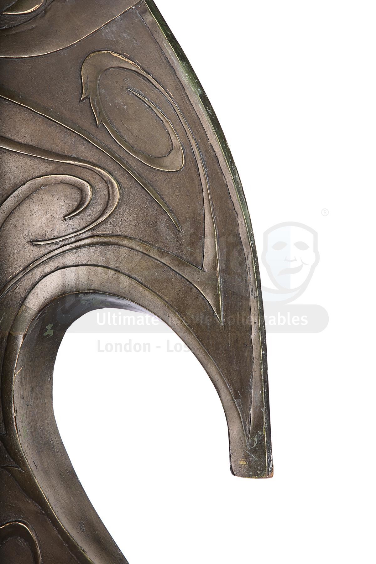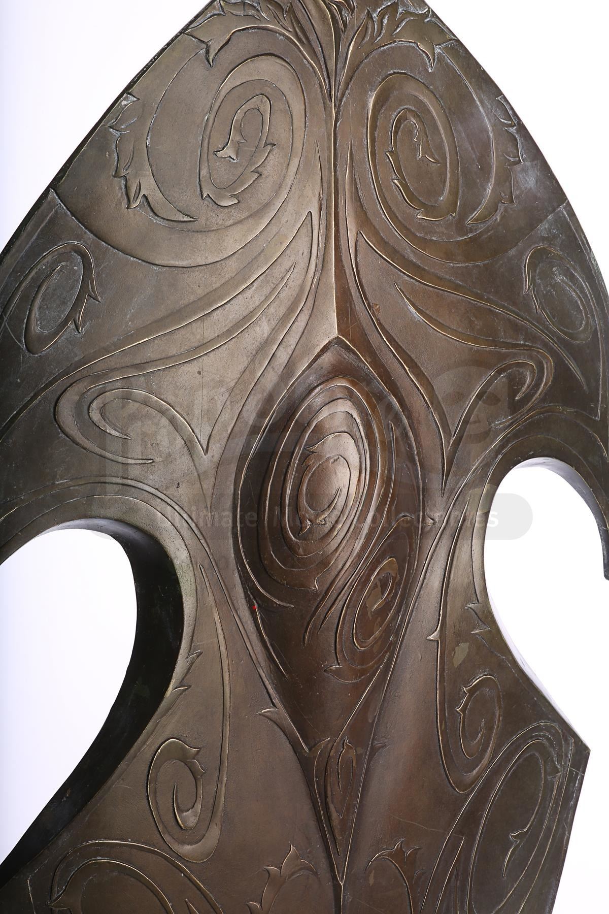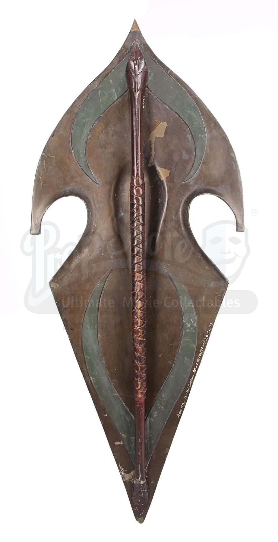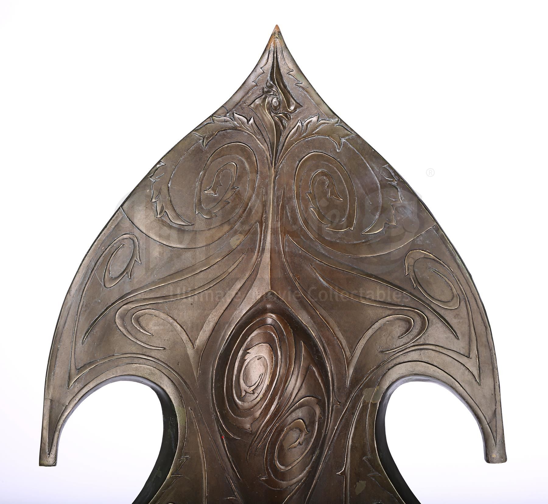 An Elven shield from Peter Jackson's adaptation of J.R.R. Tolkien's fantasy epic The Lord of the Rings. The Elven army carried shields during the film's prologue, in which the Last Alliance of Elves and Men fought against the Dark Lord Sauron (Sala Baker) and his forces at the foot of Mount Doom. Created by the artists at Weta Workshop in New Zealand, under the direction of Multi-Academy Award-winner Richard Taylor, the shield was part of a collection issued to United Cutlery for reference in producing a replica version for fans.