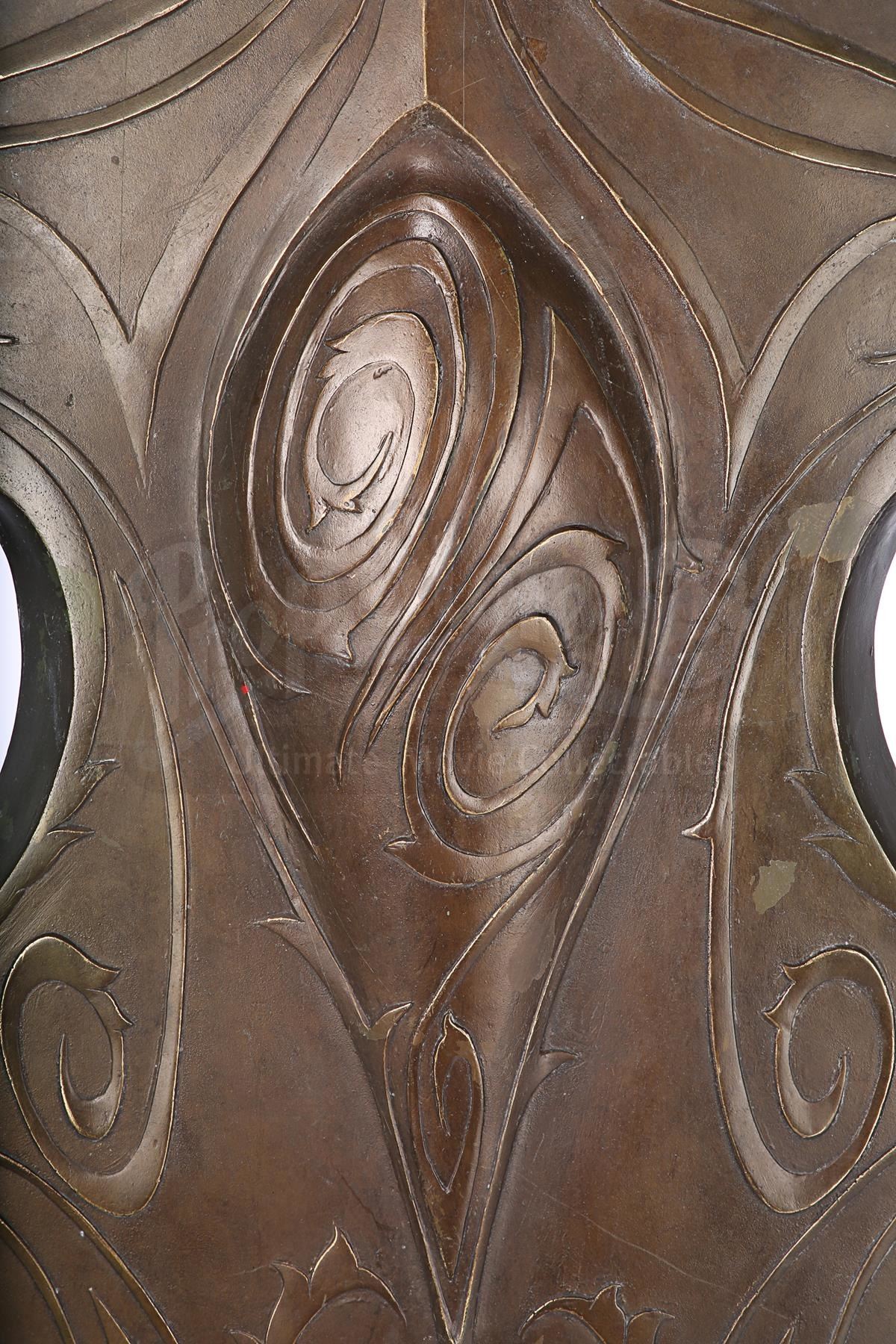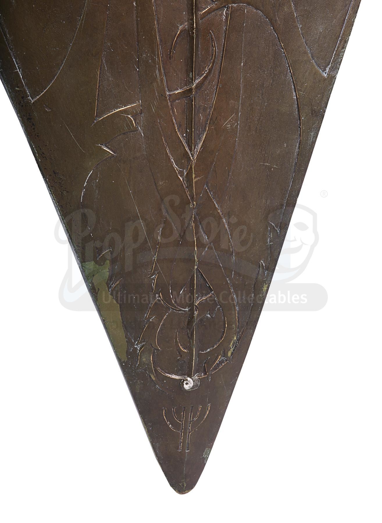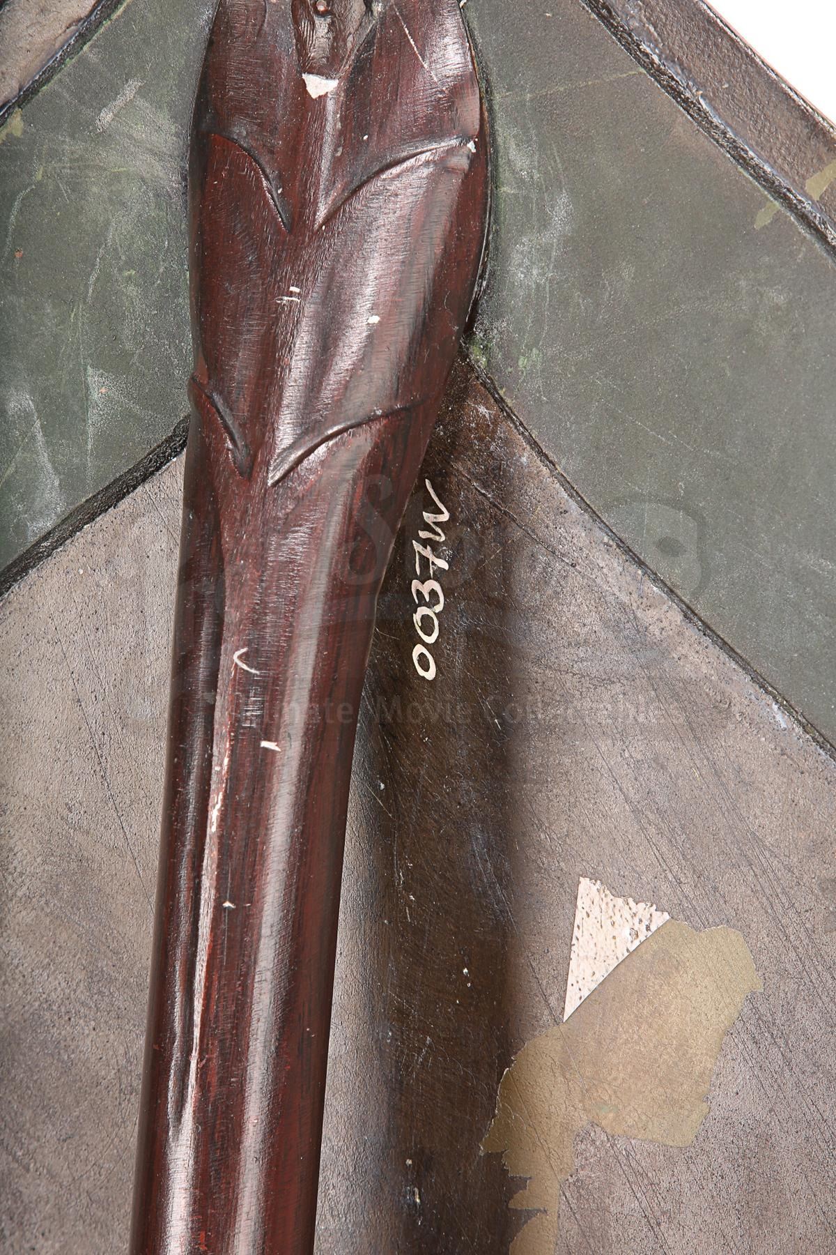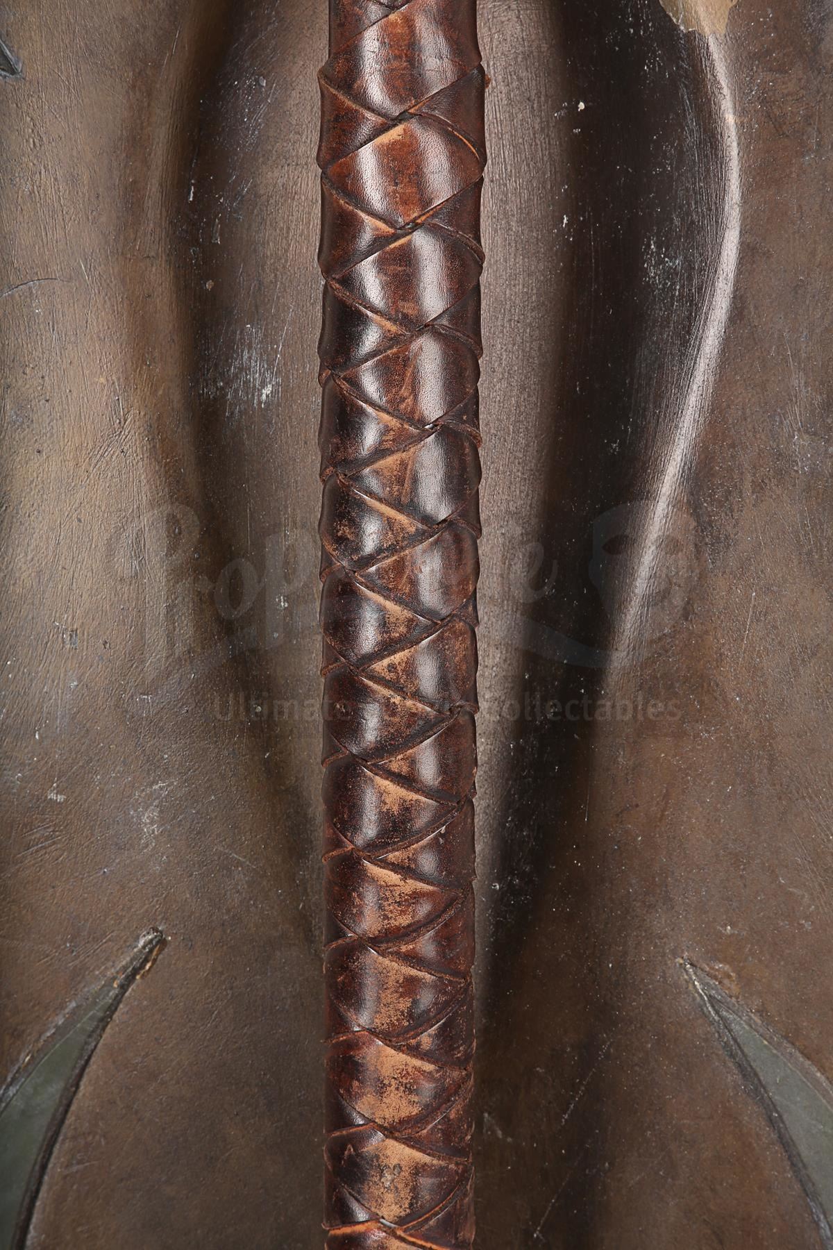The shield is made of dense urethane and resembles a large leaf, detailed with spiralling patterns and painted a dark brown colour with gold-coloured highlights, giving it a mystical, earthy feel. The back includes a vertical metal grip decorated to resemble wood and wrapped in brown leather. The high level of detail suggests it was created for moments when an Elven shield was in close proximity to the camera. It exhibits minor wear due to production use, including scuffs to the paint and slight wear to the pointed tips.