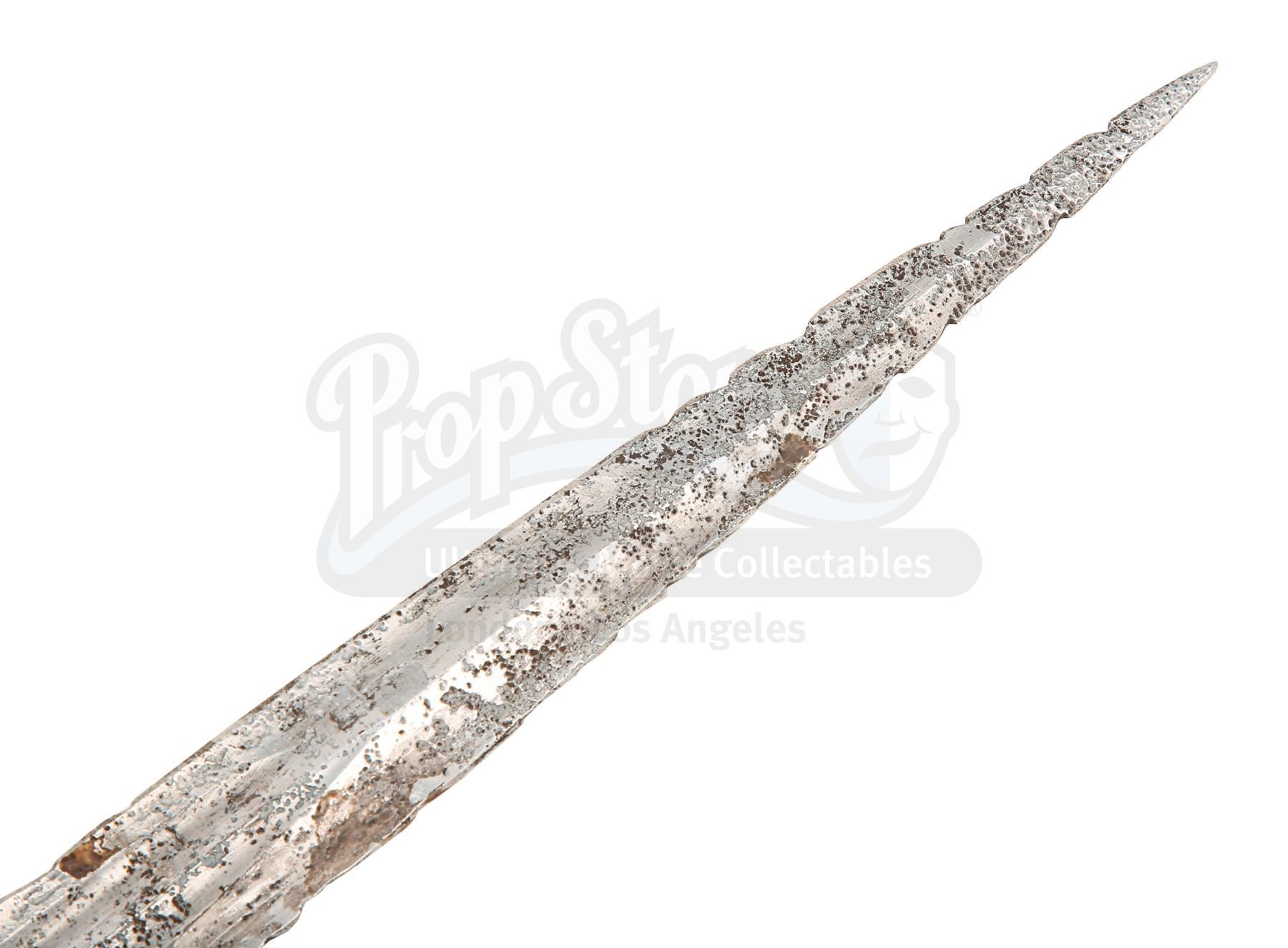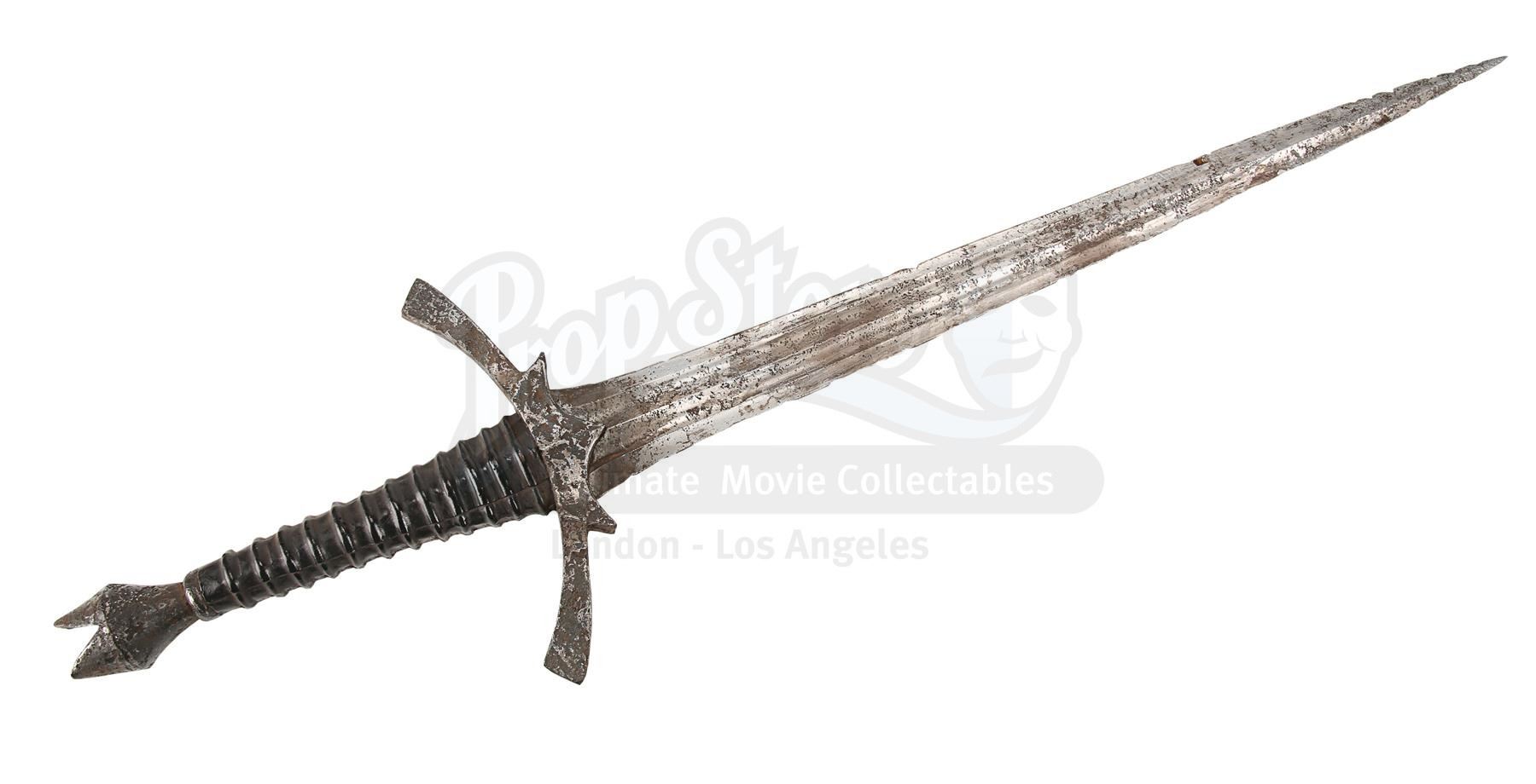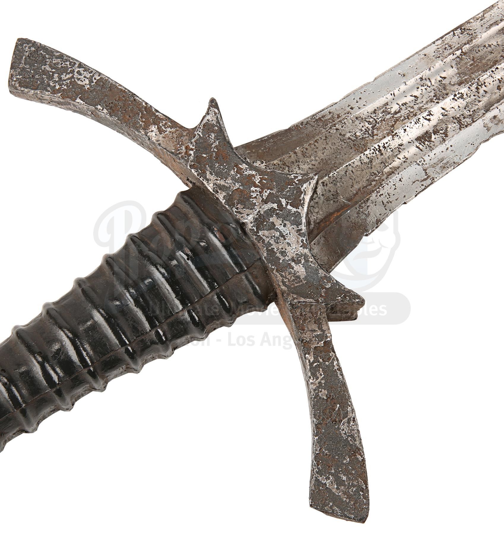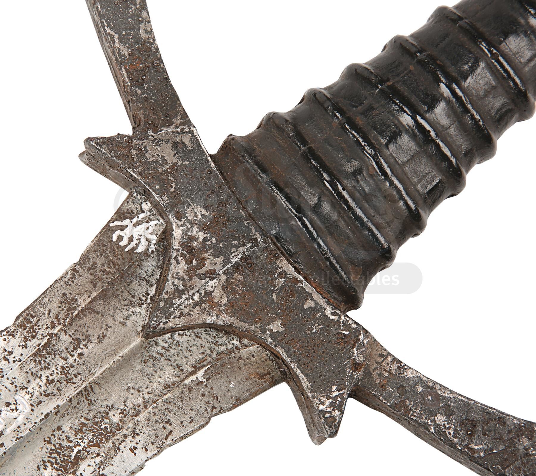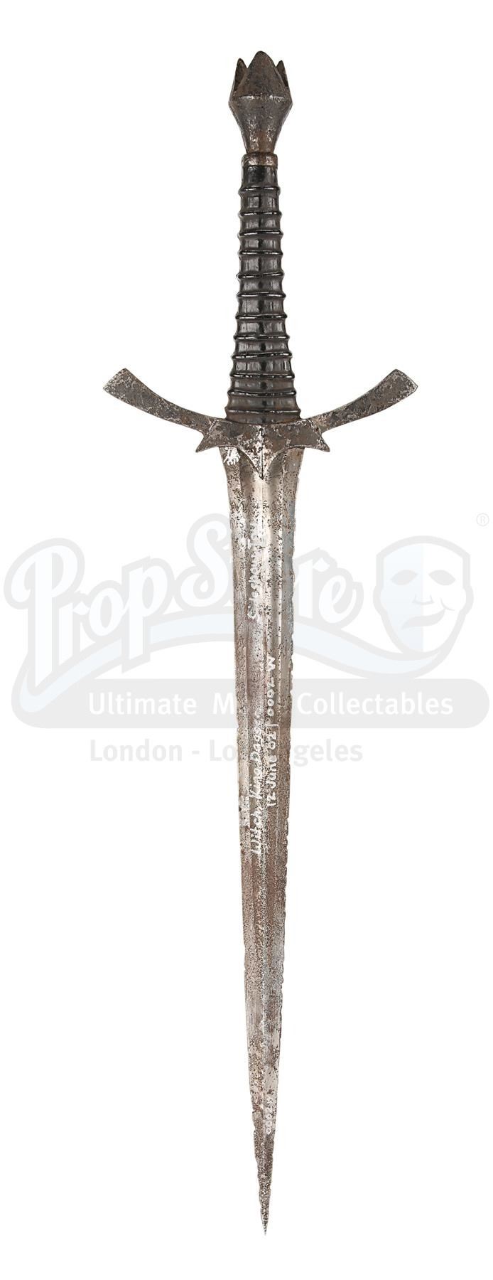 Constructed by the world-renowned Weta Workshop, lauded for its achievements in designing and constructing props that were faithful to Tolkien's writing, this prop dagger features a jagged aluminium blade affixed to a ribbed resin handle with a pointed cross guard and spiked pommel. The dagger has been weathered in shades of faux silver and brown, giving it the appearance of rusted iron, and is one of a small number of principal-character Lord of the Rings pieces in private hands today.