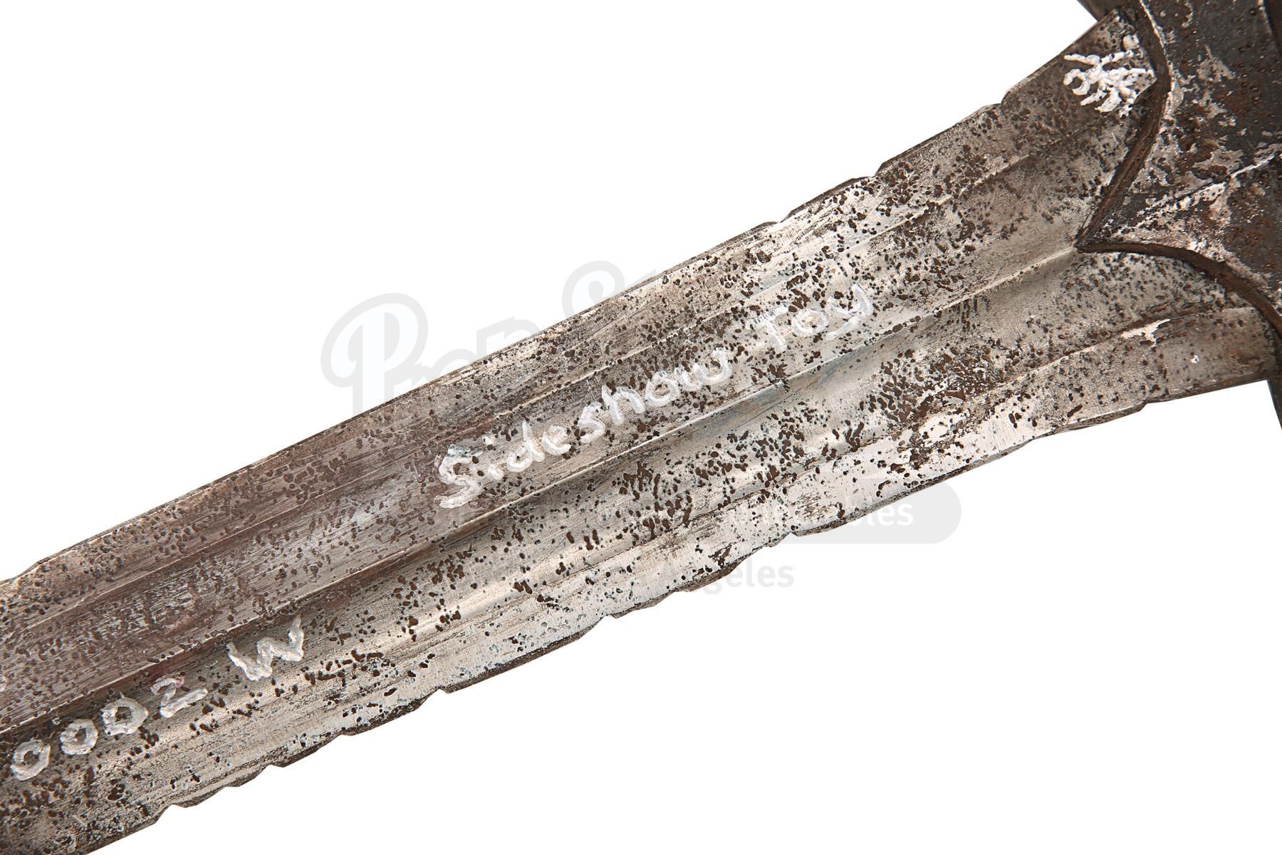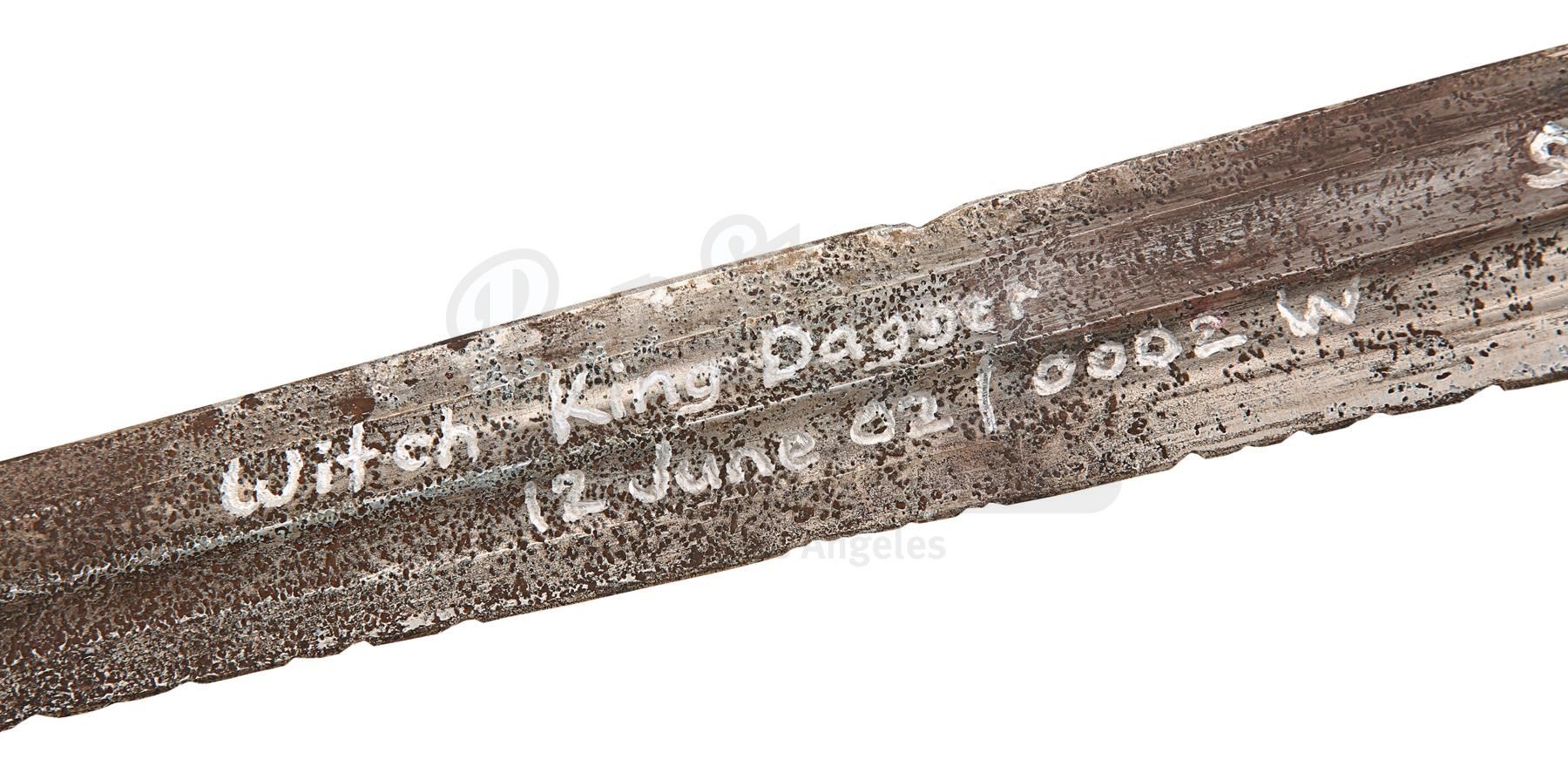This particular piece was gifted to executives at Sideshow Toys, who visited the set in 2002. As Sideshow Toys was licenced to distribute collectibles from the Lord of the Rings films, the executives were allowed to choose mementos from the set. It was at the request of director Peter Jackson that these select props be branded with a unique code and note of ownership. This item has a brand reading "Witch King Dagger 12 June 02 l 0002 W Sideshow Toy". The piece exhibits