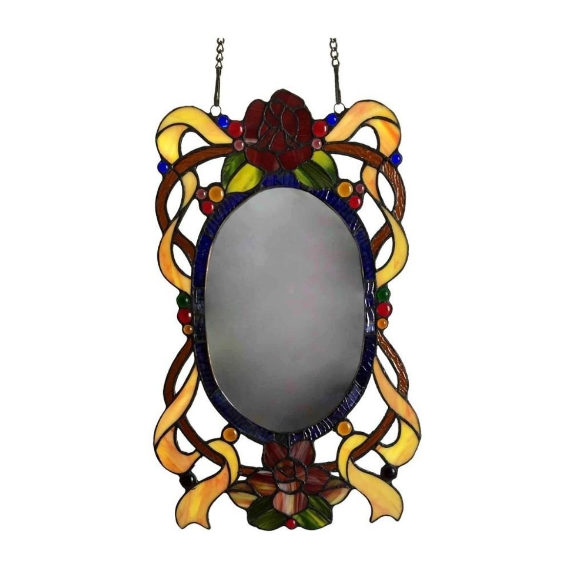LORE, a Tiffany-style stained glass window panel mirror. Designed to match traditional and English country furnishings, this floral Mirror will add an aura of charm to your home. It is a mirror outshines its competition in looks. Overall Width11 Overall Height19 Max Hanging Distance32 Net Weight (lbs)5 Panel Chain Length27.50 Glass TypeTiffany-glass Glass Thickness0.12 Est. Glass Cuts117 FinishBlack Overall MaterialsGlass, metal & copper Specific UsesIndoor