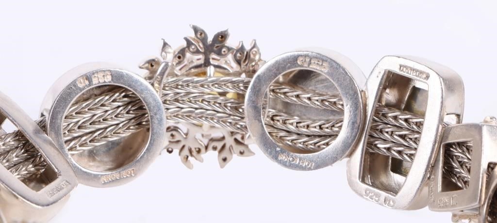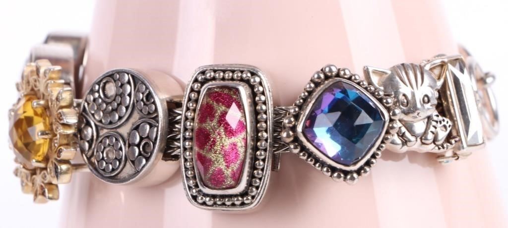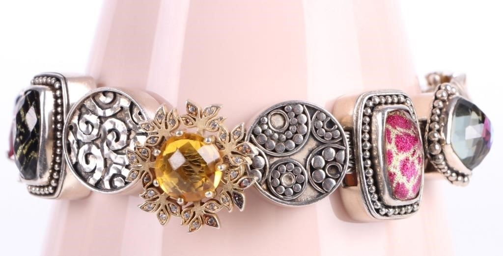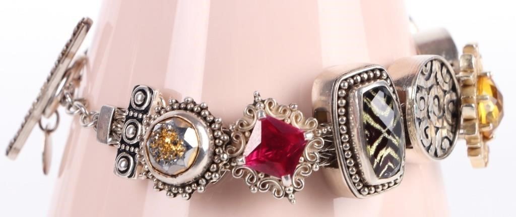 Lori Bonn sterling silver chunky ladies bracelet. Bracelet features one 2.5ct square-cut ruby and one 4.0ct round citrine and one mystic topaz.